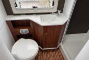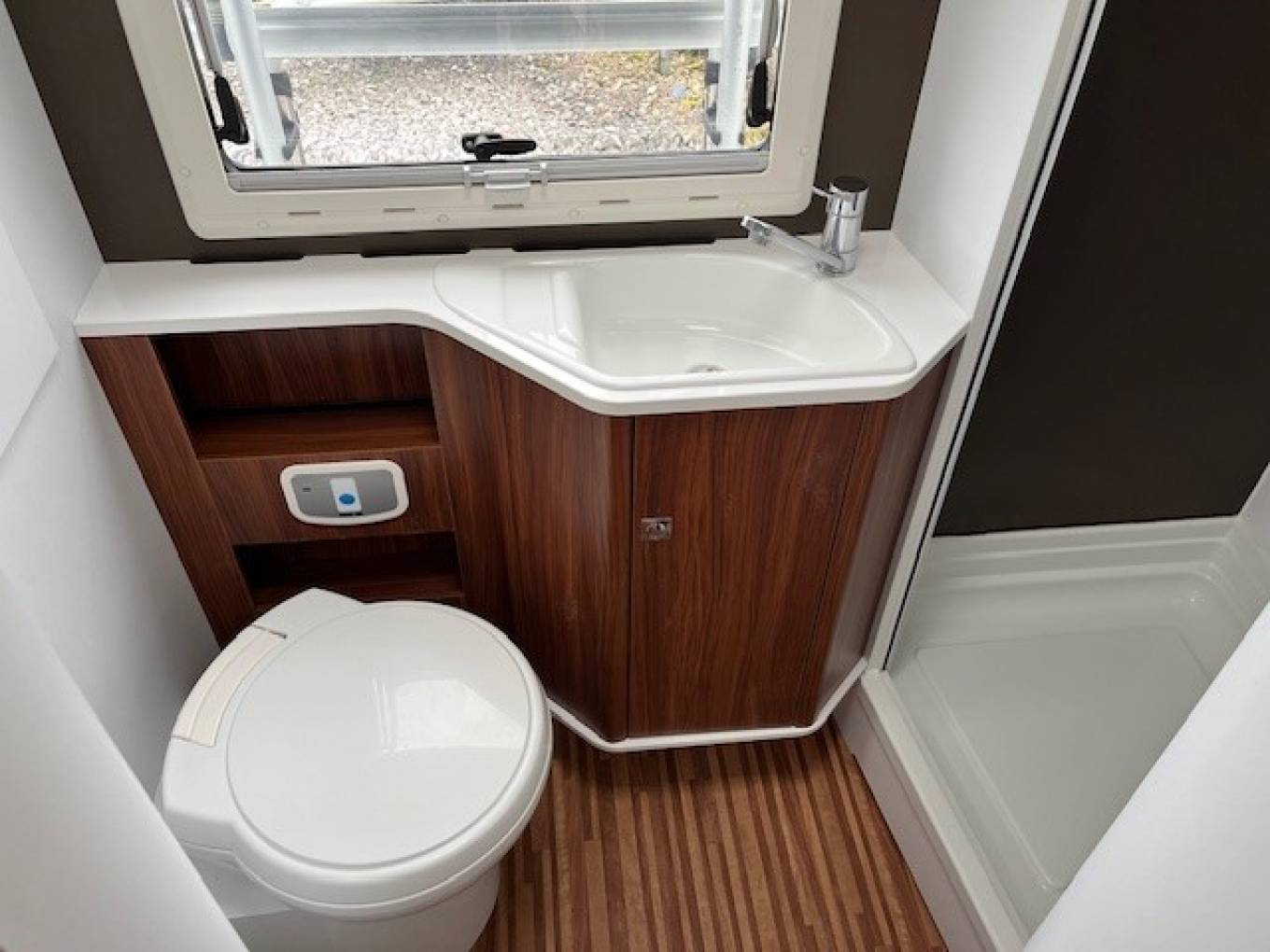 This Motorhome Benefits from a Very Spacious End Washroom which includes a Toilet, Washbasin and Full Size Shower Cubicle