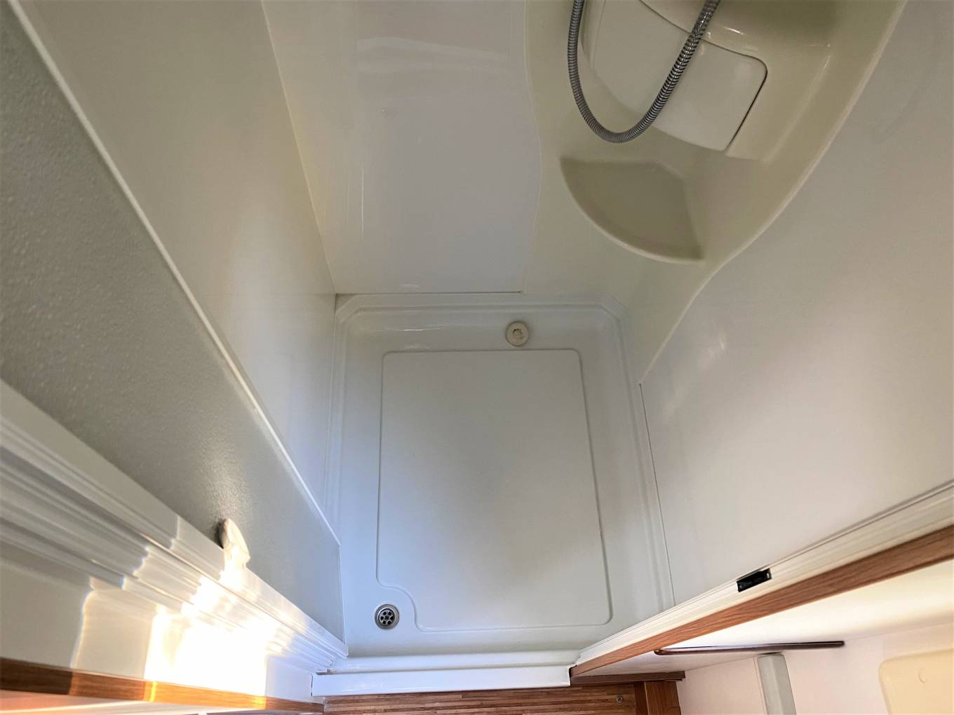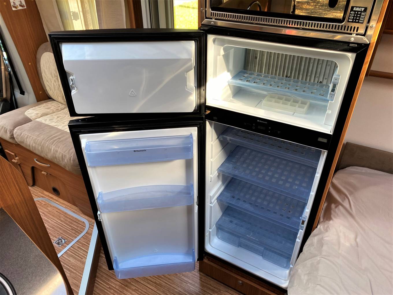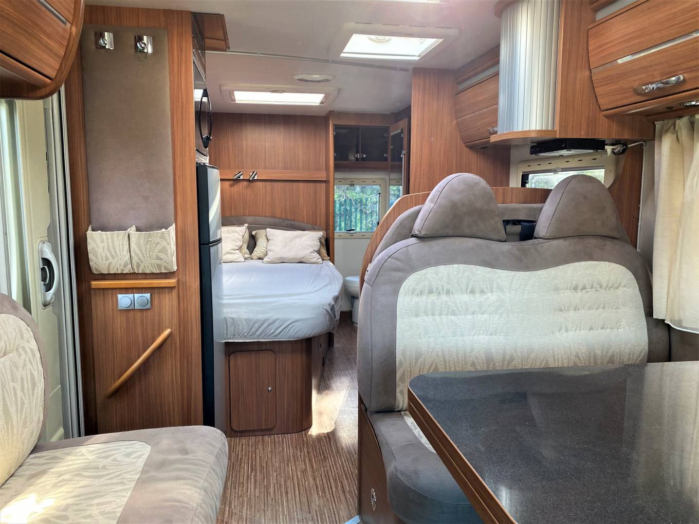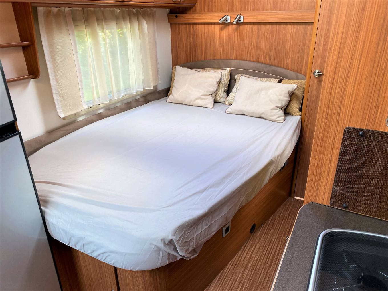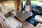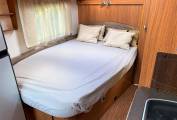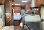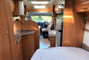 As well as the rear fixed bed there is a large front lounge incorporating 2 front swivel seats and dinette with 2 lap and diagonal seat belts. There is a full width bathroom across the rear with separate shower as well as a partition which sections off the bedroom.