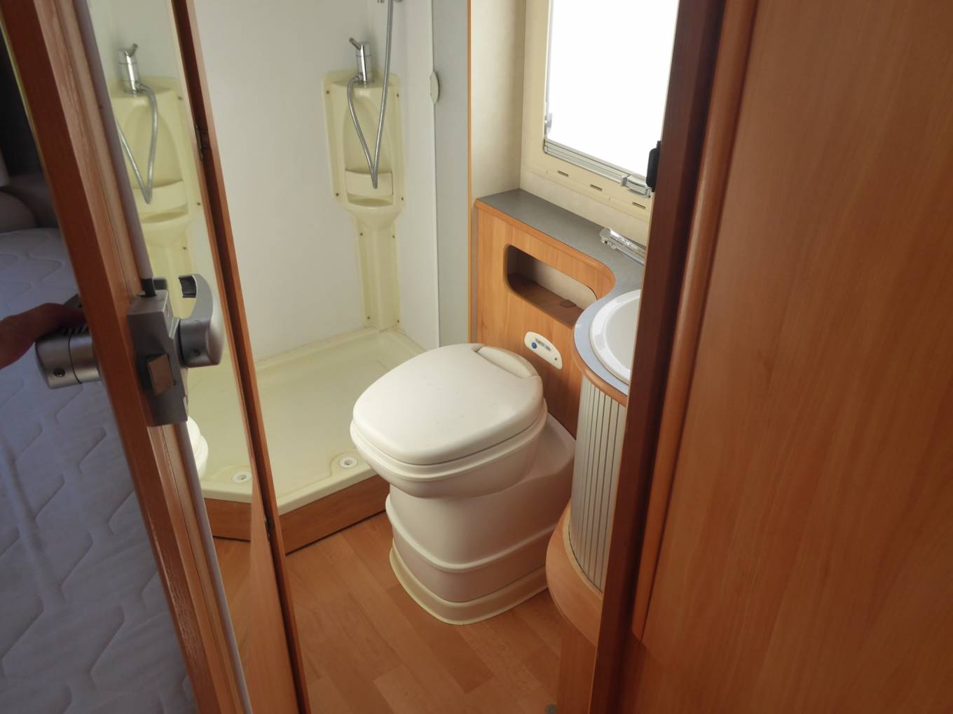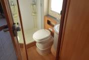 At the rear of the vehicle is fixed French double bed with storage underneath, and the bathroom, which contains a toilet, a hand basin, and a shower cubicle.