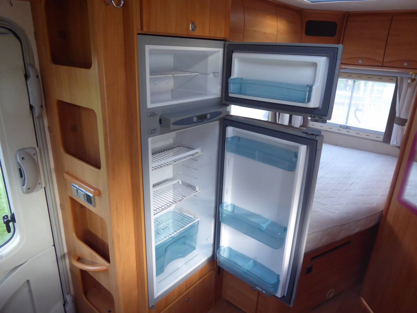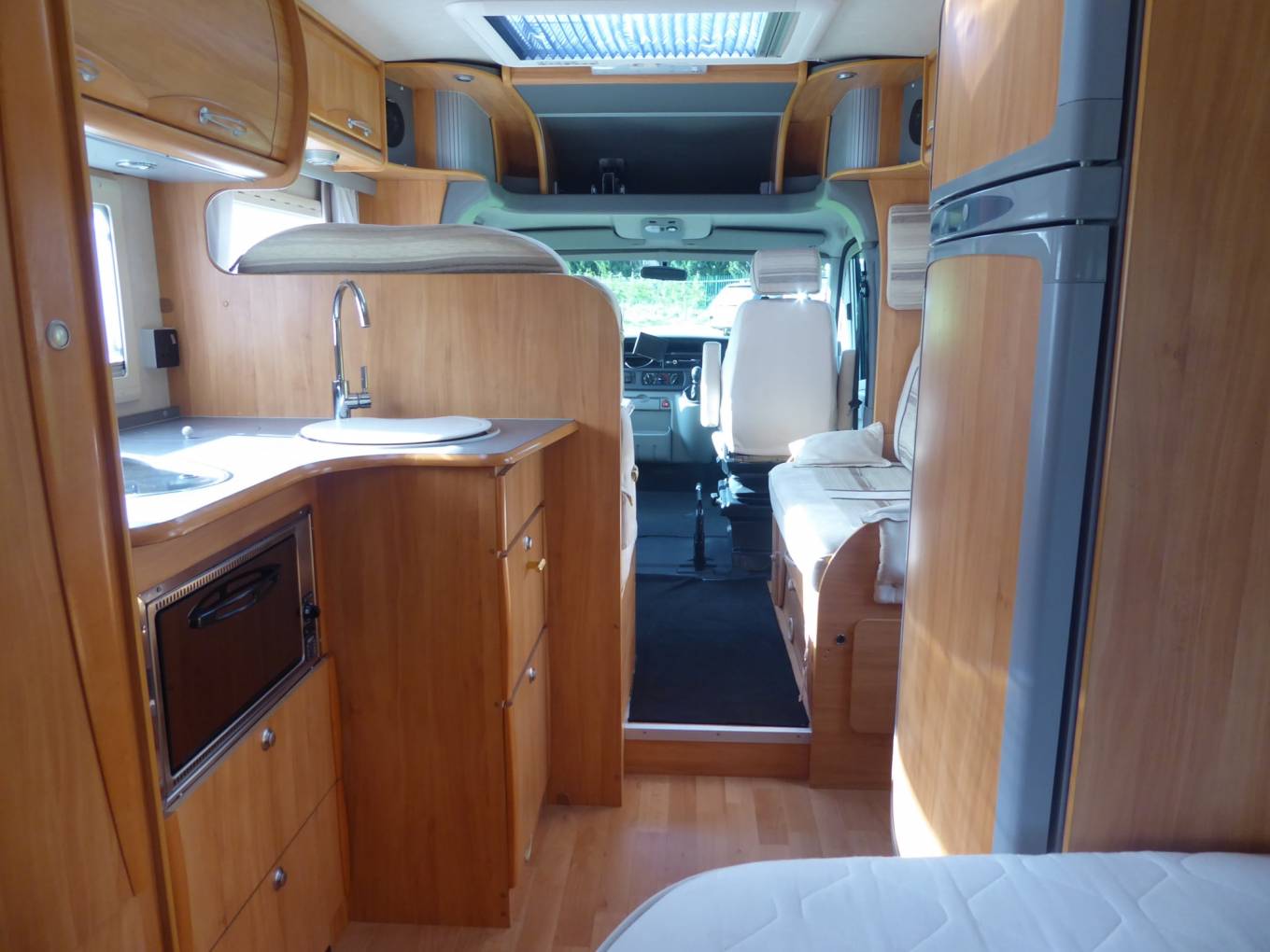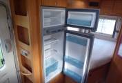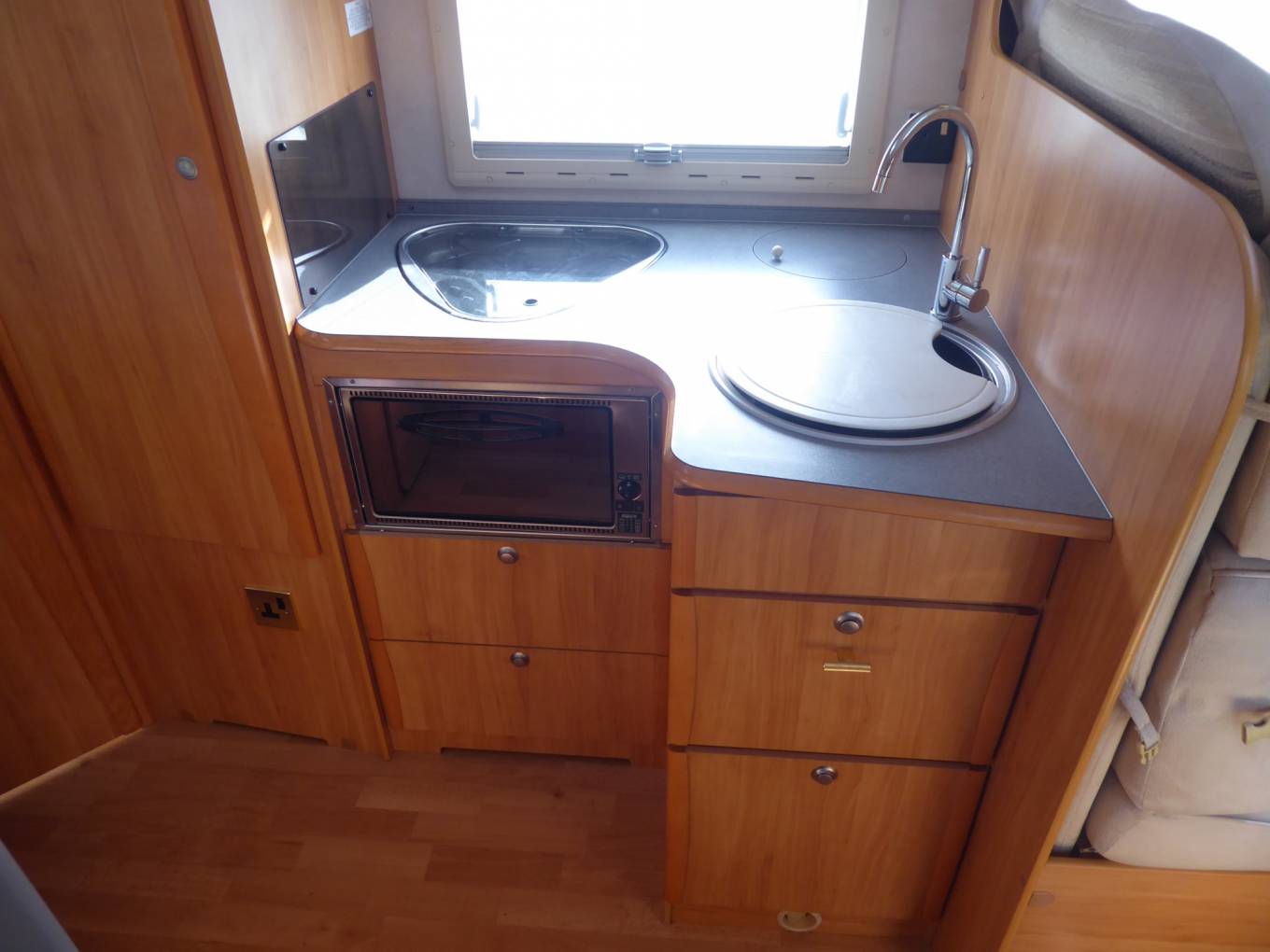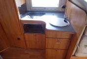 Beyond the dinette, conveniently adjacent for food storage and preparation, is the central kitchen, complete with a sink, an oven/ grill combination, a hob with 3 gas burners, an extractor fan, a fridge, and a separate freezer.