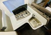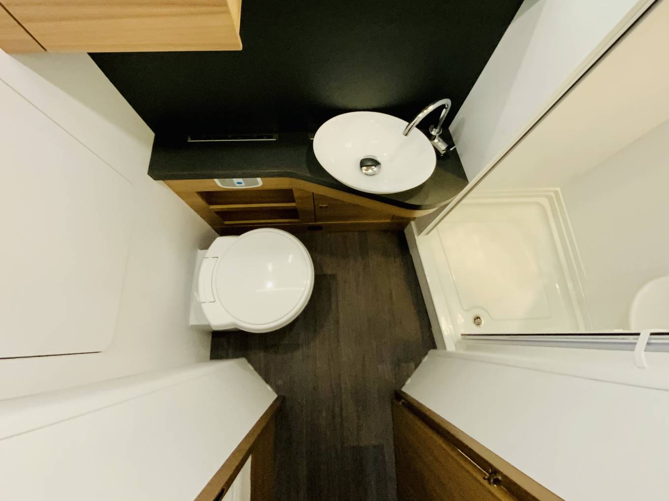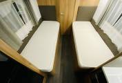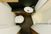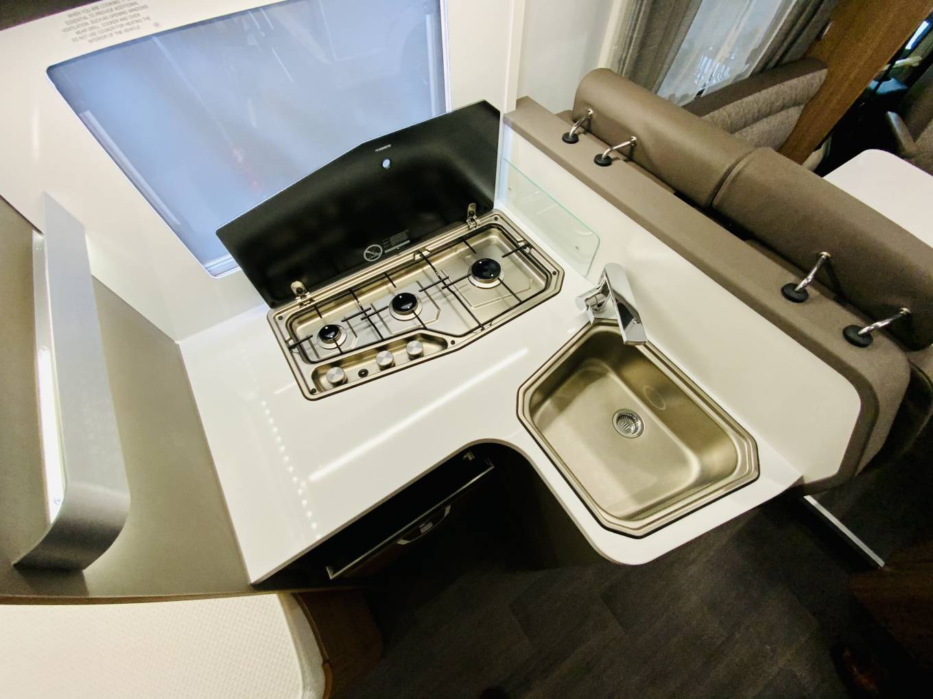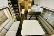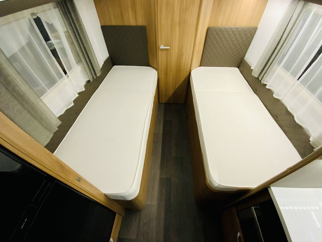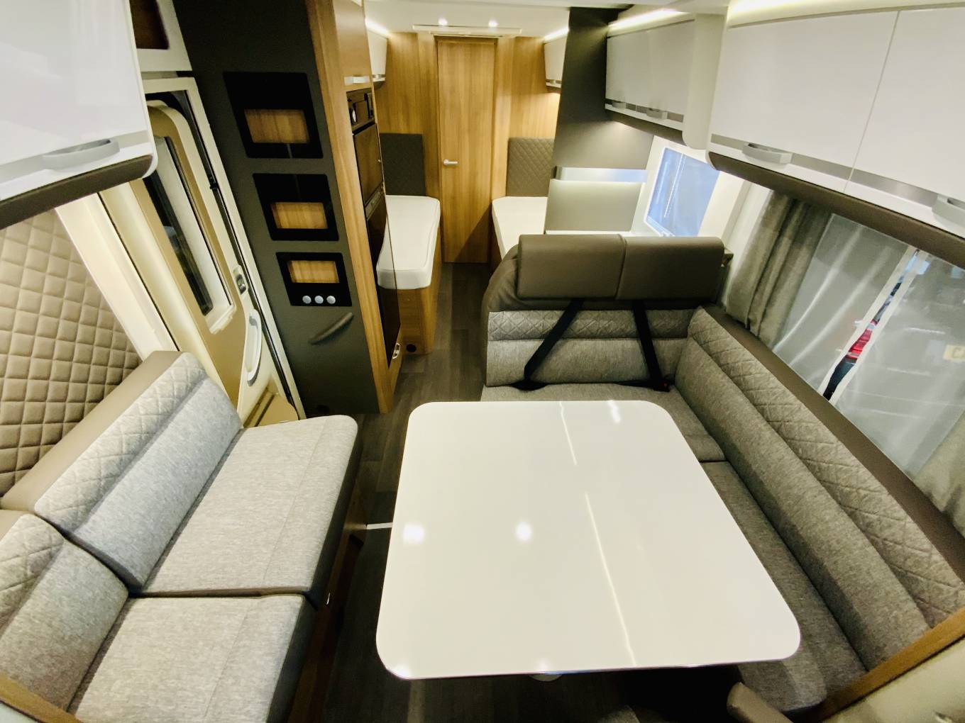 Firstly, we start at the large end wash room. Which has plenty of storage and an includes a separate shower cubicle, toilet and wash basin. Next is two comfortable single beds with ample storage underneath. As we walk forward we arrive at the well equipped kitchen. The kitchen consists of a gas hob, oven, grill, separate 3 way fridge freezer and a wash basin. To the front is the dinette which would seat 5 comfortably and features 3 seat belts, making 5 in total. Above the dinette is the very spacious and comfortable drop down electric double bed.