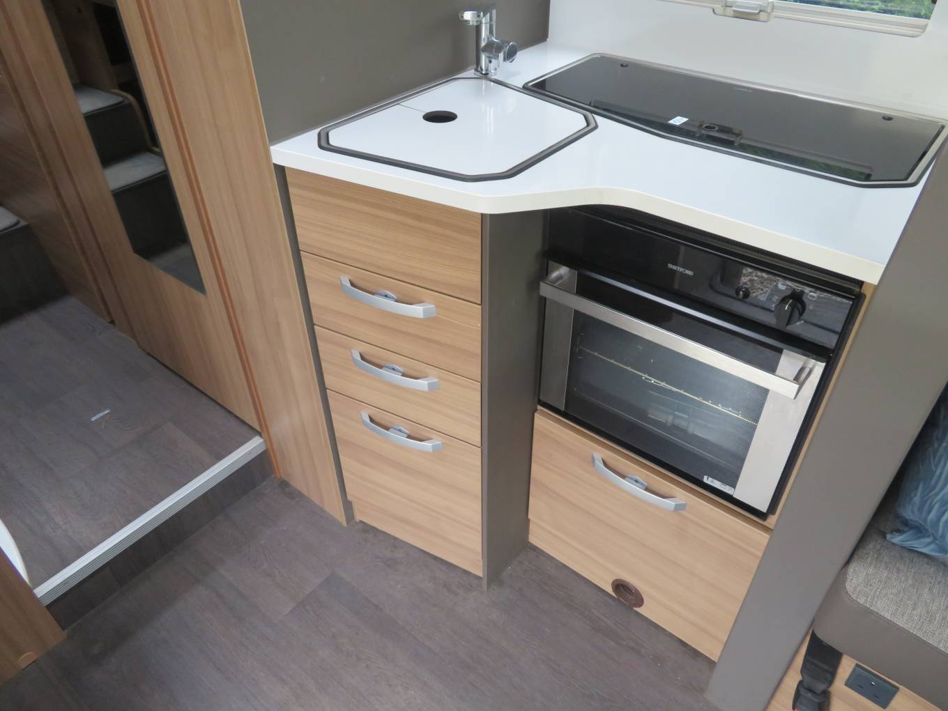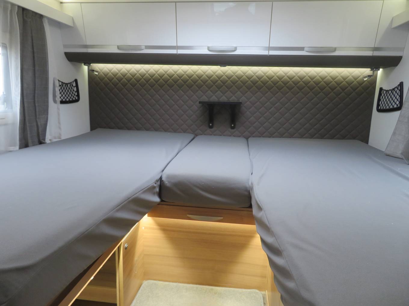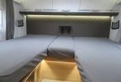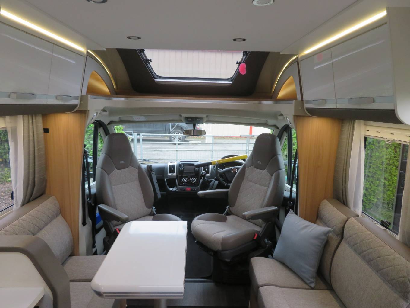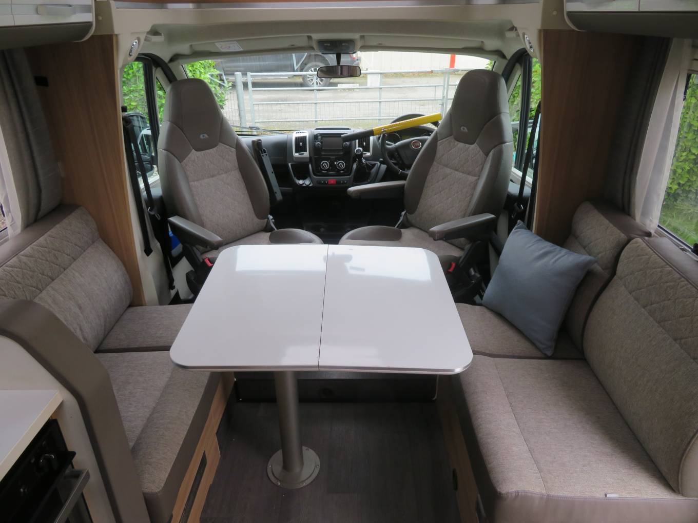 If you are looking for a spacious luxury Motorhome, then look no further. This Motorhome offers loads of space and comes with stacks of extras. Firstly, we start at the rear of the Motorhome with the twin single fixed bed that can also become a large double. There is a twin wardrobe at the foot of the bed. Also to the rear is a huge garage. You will also find a lovely washroom inc toilet and wash basin and a separate shower cubicle opposite. Next, is the well equipped kitchen. This consists of a large separate fridge freezer, gas hob, oven, grill and wash basin and lots of storage. To the front is a dinette area that seats 5 comfortably and when the night draws in a double bed drops down.