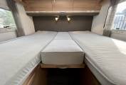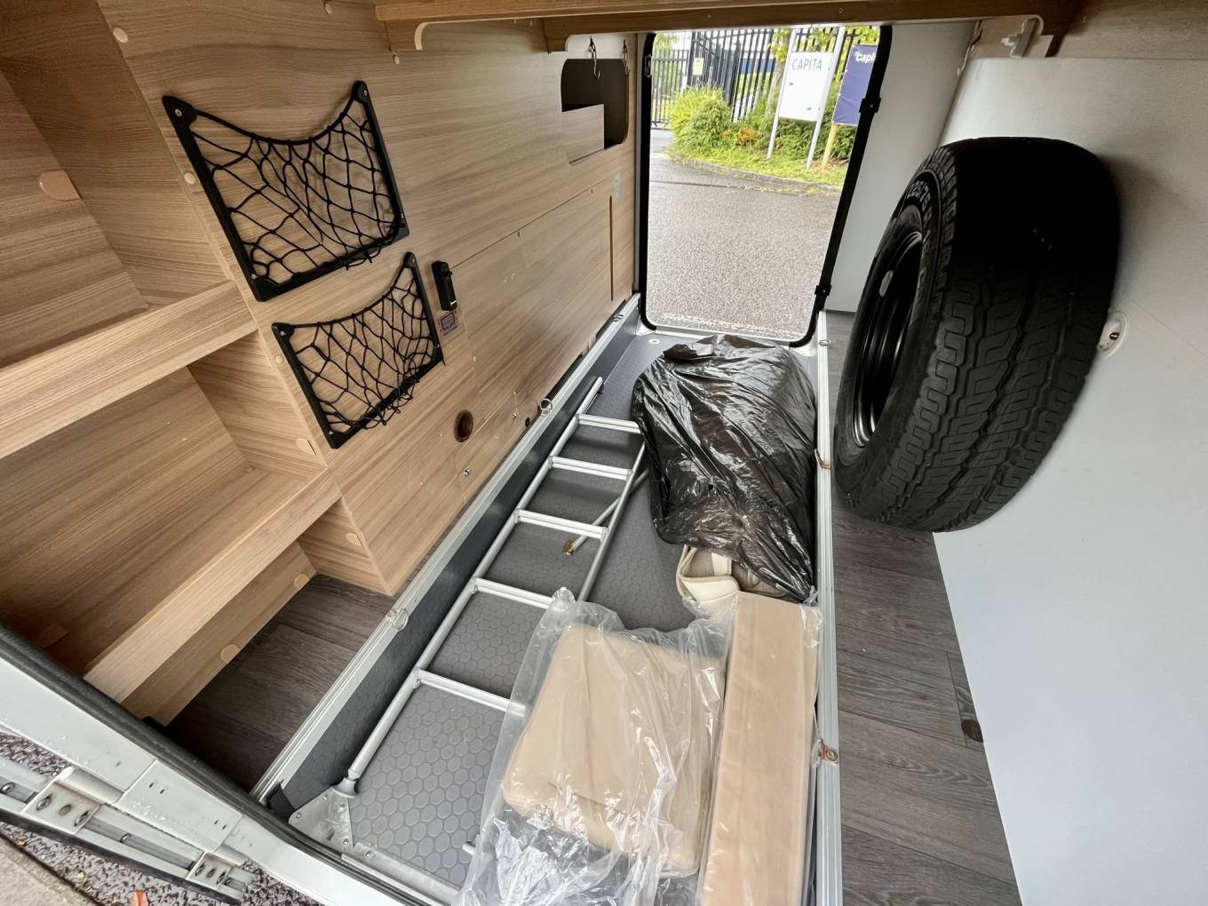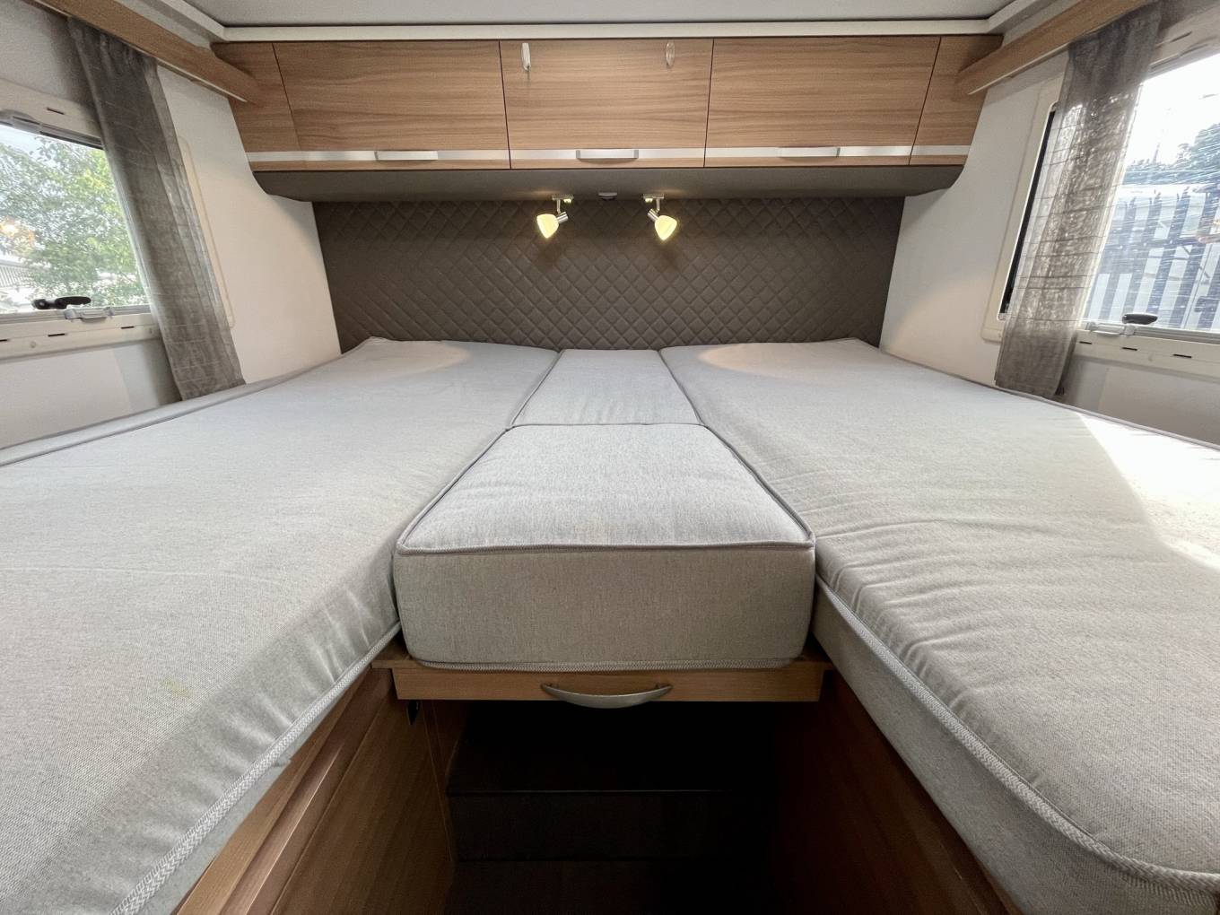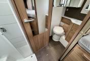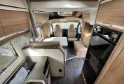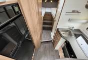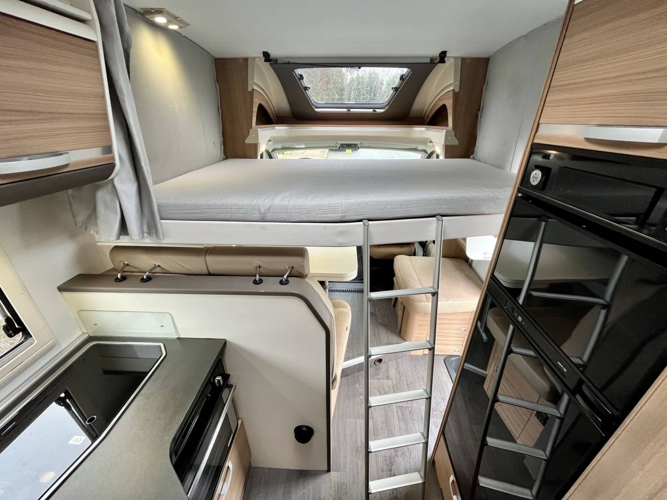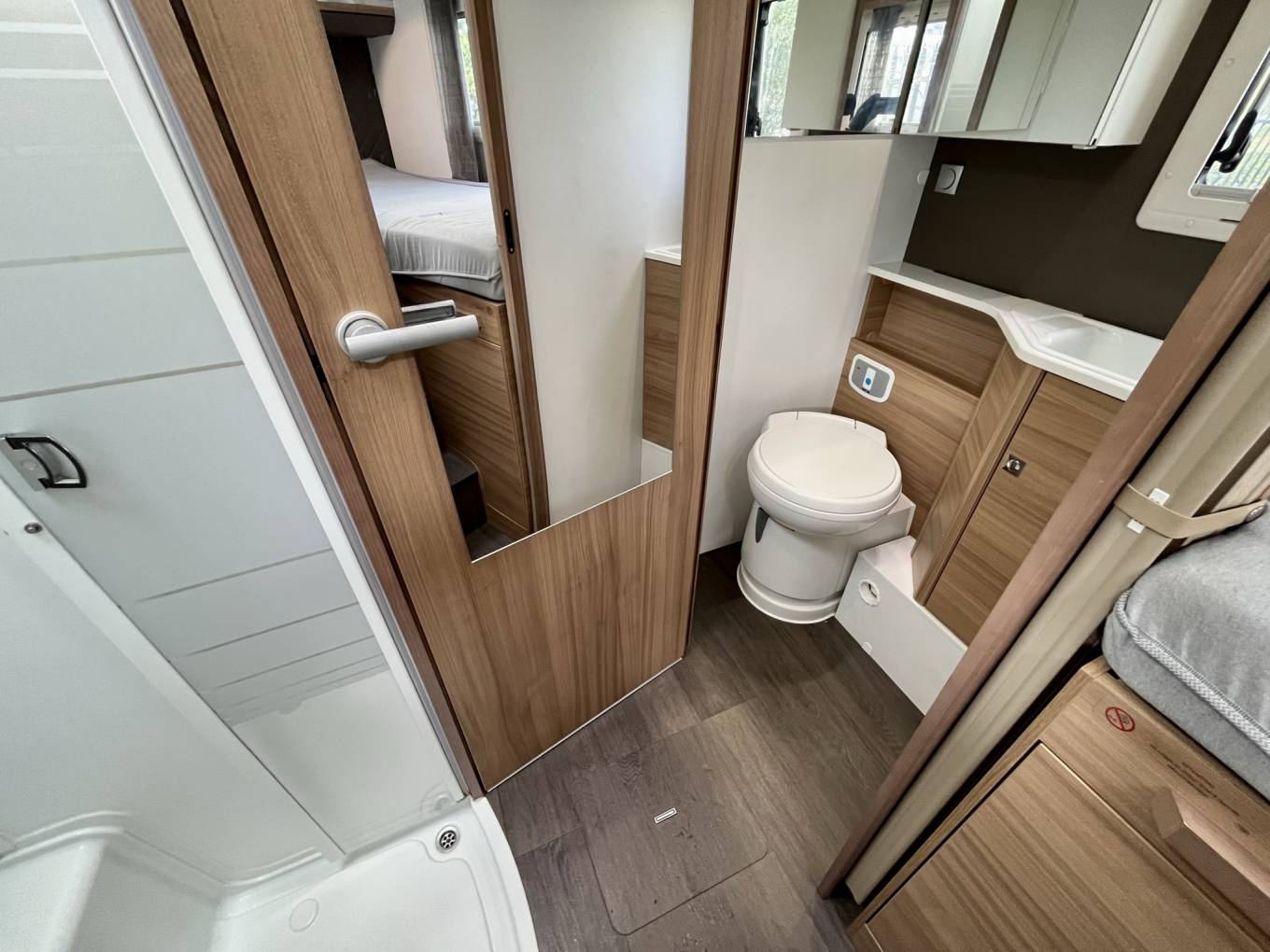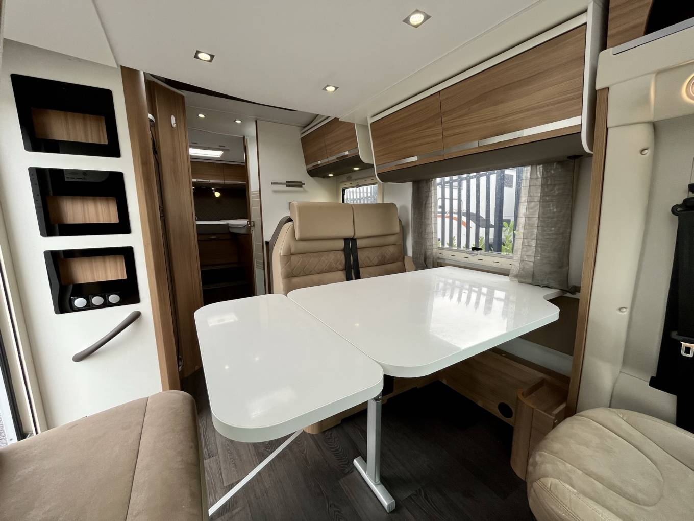A fixed rear bed built above the large garage, with solid door to section off the rear as a full bedroom with toilet and separate shower cubicle opposite. Electric drop down double bed that can be easily stowed away with the push of a button. Ample seating that can comfortably accommodate 5 adults around the extendable dining table. Cooking facilities include sought-after tall fridge with integrated freezer; combi oven/grill; sink with mixer taps and 3 x gas hobs.