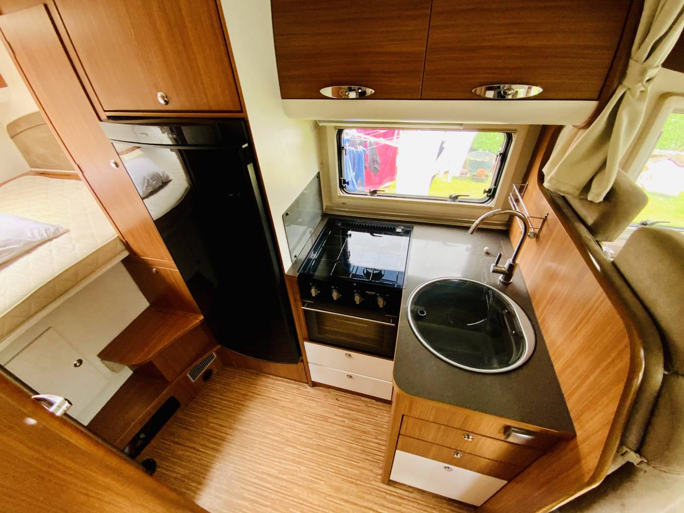 Firstly, we start the rear fixed transverse bed. Which is a large double with a good sized garage below. Next is a washroom complete with shower, toilet and wash basin basin. Opposite, is a well equipped kitchen which includes a large 3 way fridge, gas hob, oven, grill and wash basin. To the front is the dinette that seats 6 comfortably and converts to a double bed. About is a comfortable drone down double bed completing the 6 berth.