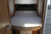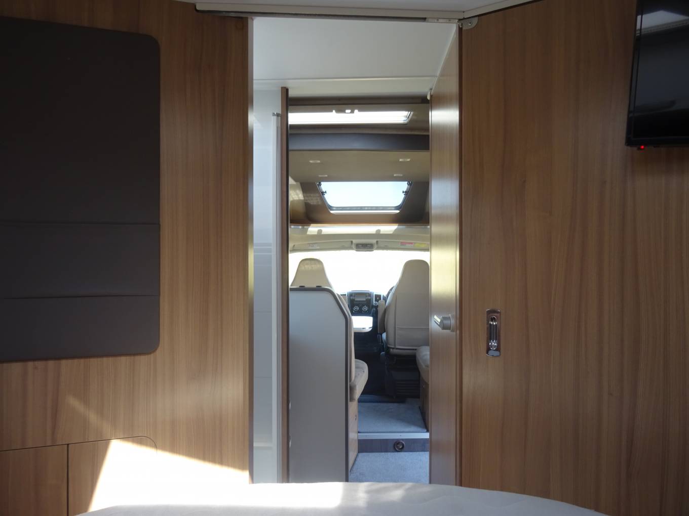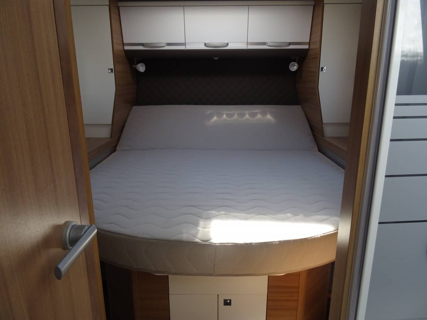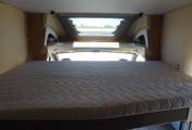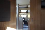 At the rear, we have a very large and comfortable island bed 6ft 4" x 5ft 2", this bed has an electrically controlled up/down position to give us choice on garage size. The bed can also be pushed back to give us the head rest at the back and more bedroom space. The bed also lifts up for access and storage, and has fitted drawers. There are hanger wardrobes either side and tables for your morning drinks (crucial). It is well lit, there are windows and sky light, a TV, 240v socket, storage lockers and wooden slide door.