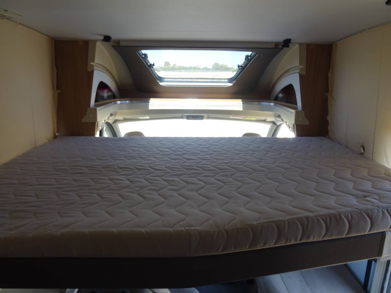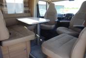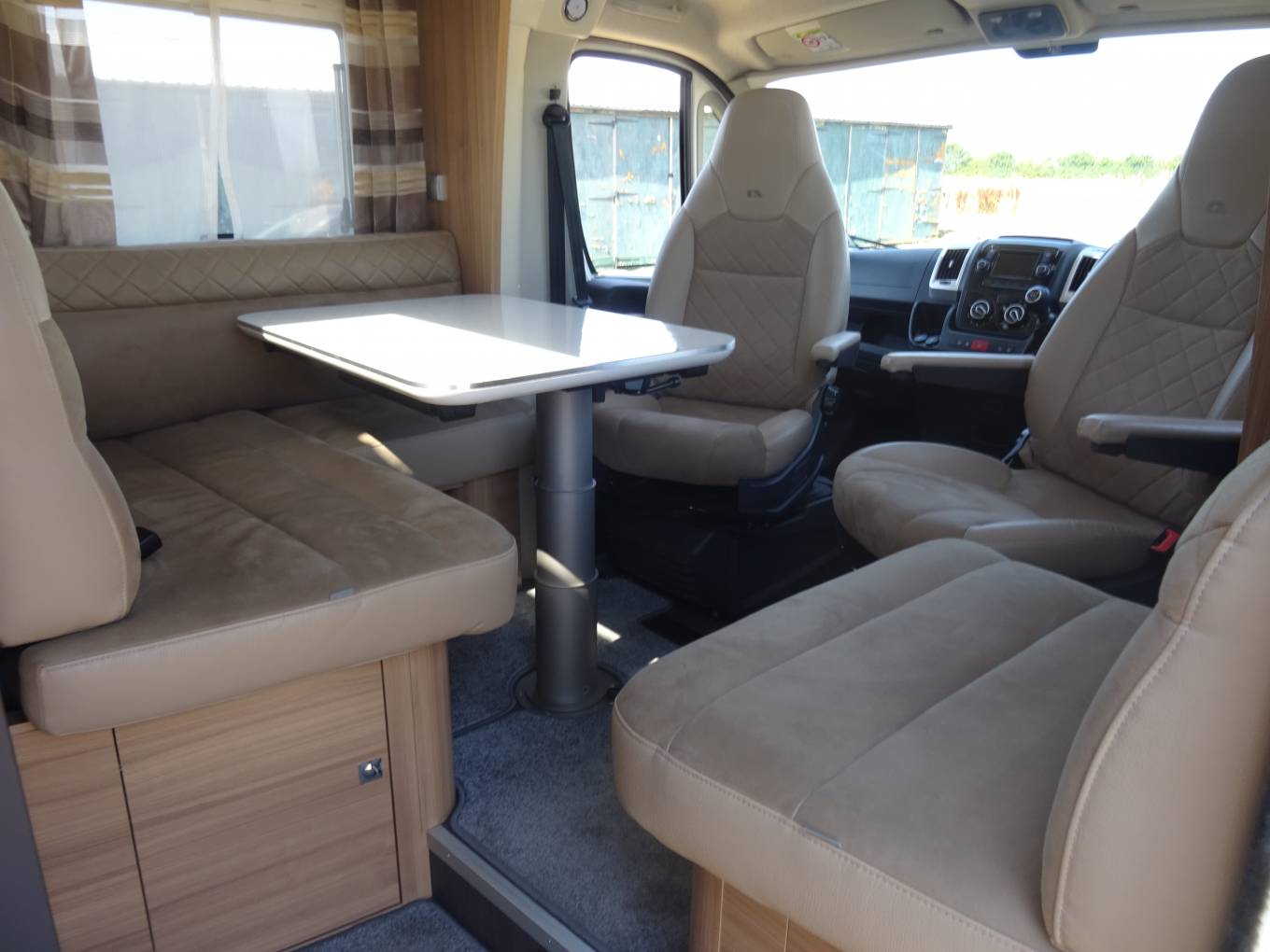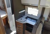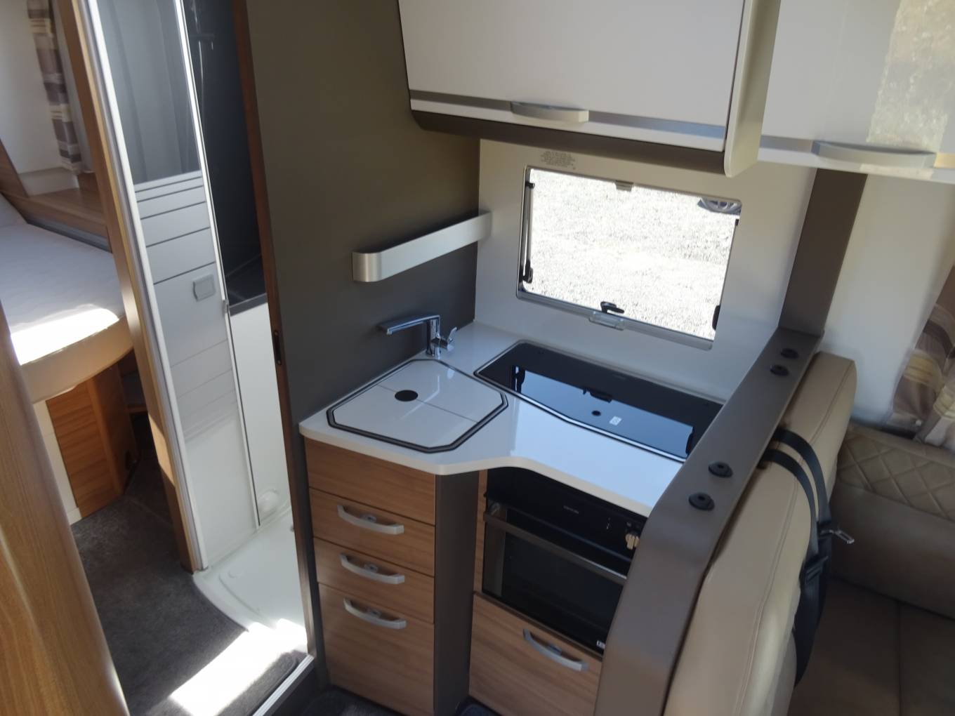 The lounge area is magnificent especially with the seats swiveled - with a double bench seat, (belted), side seat (belted - side or rear facing) and a large adjustable table, all enhanced with a huge panoramic sky light. The ceiling above is spot lit, this being the under side of the electric drop down bed measuring 6ft 2" x 4ft 2". There is over lighting for when the bed is down and safety netting. There are overhead storage lockers in this area. Heating/hot water is both gas and electric (Truma) and I-net ready.