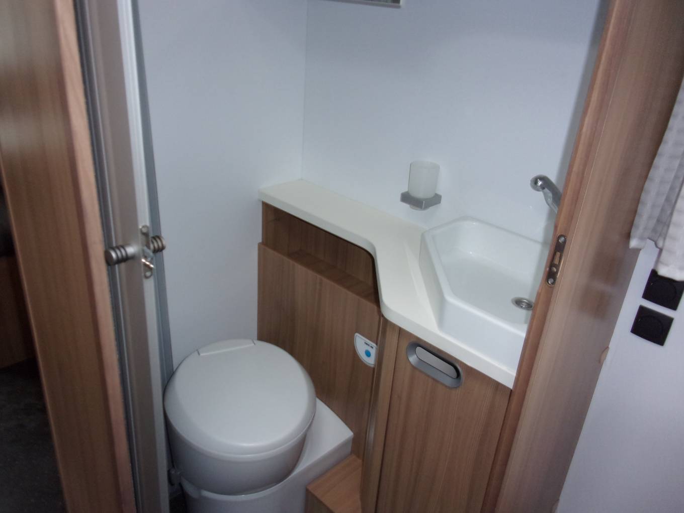 Cubicle on one side of the Motorhome and the Toilet Area and Sink Unit on the