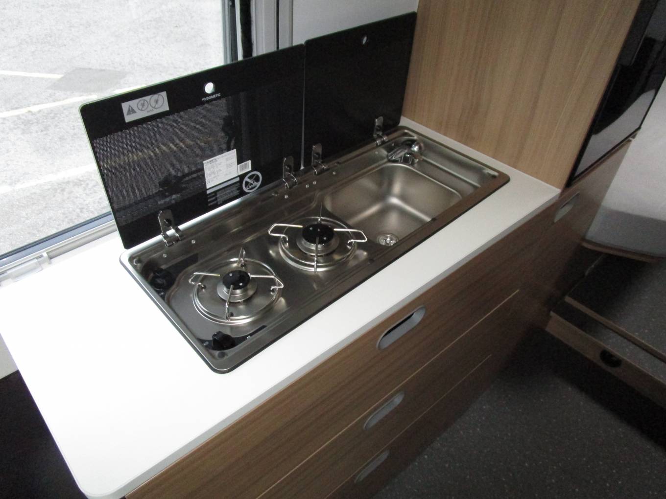The bathroom includes a shower, basin and toilet whilst the kitchen is equipped with 2 burner hob, 90L compressor Fridge and plenty of cupboard storage.