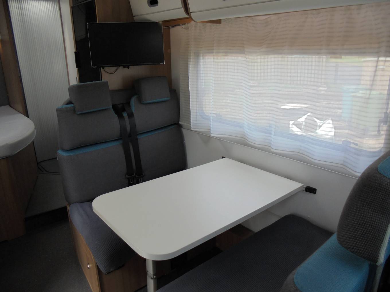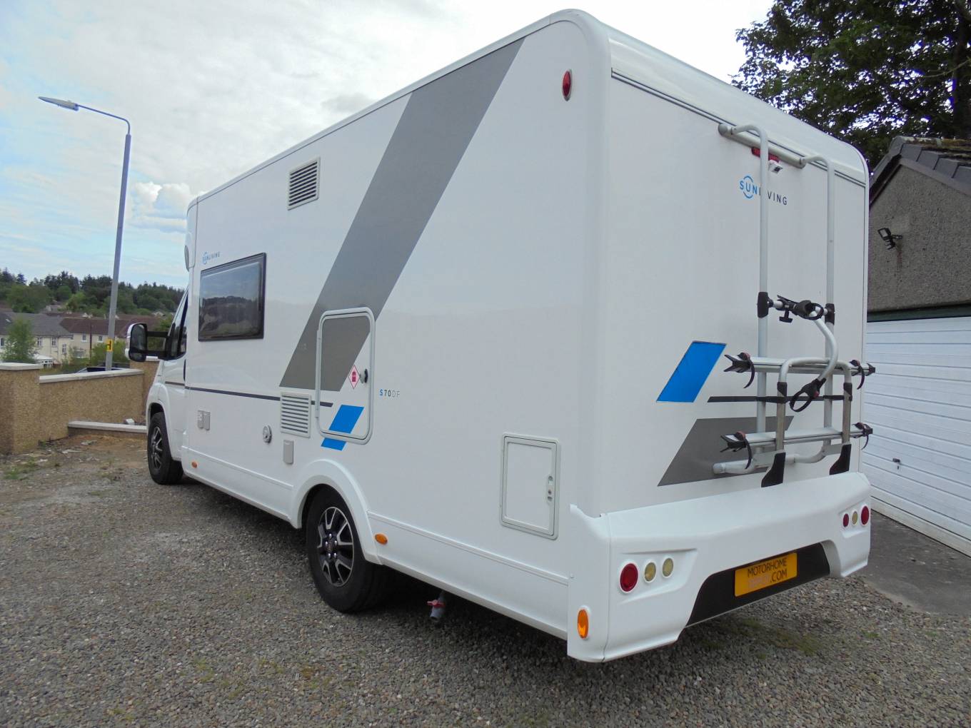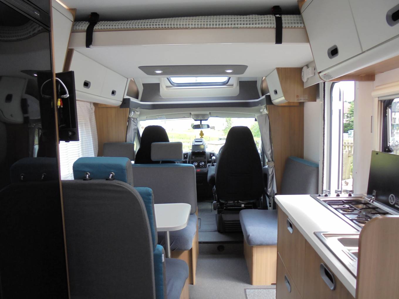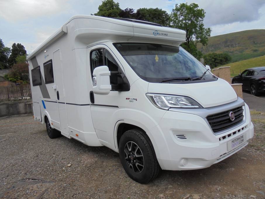 This Sun Living motorhome includes the following extras: Drivers Pack: Cab Air-Conditioning, Cruise Control and Passenger Airbag. Comfort Pack: Truma 4E heating, upholstered cab seats, colour coded bumpers and a flyscreen for the hab door. In addition the owners have fitted a 2 Bike Rack, Outside Fixed Awning, SATNAV, Reversing Camera, Avtex TV and VisionPlus Aerial and it has been installed with a LPG Gaslow easy to fill system.