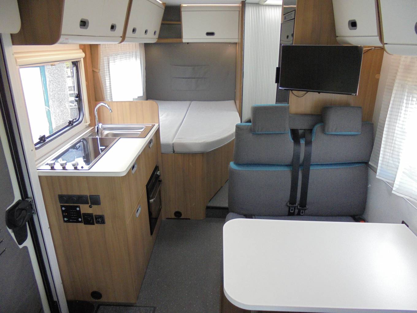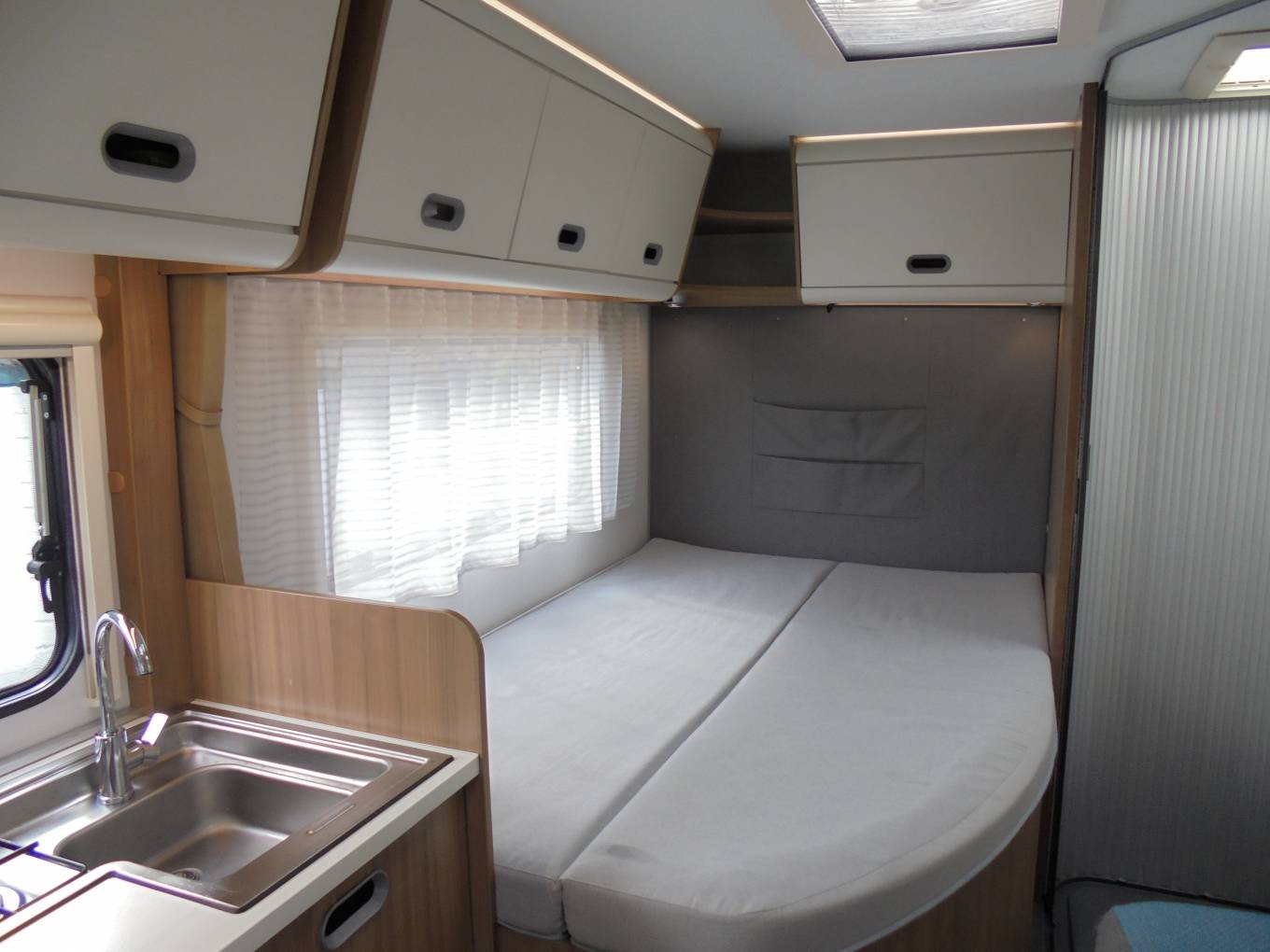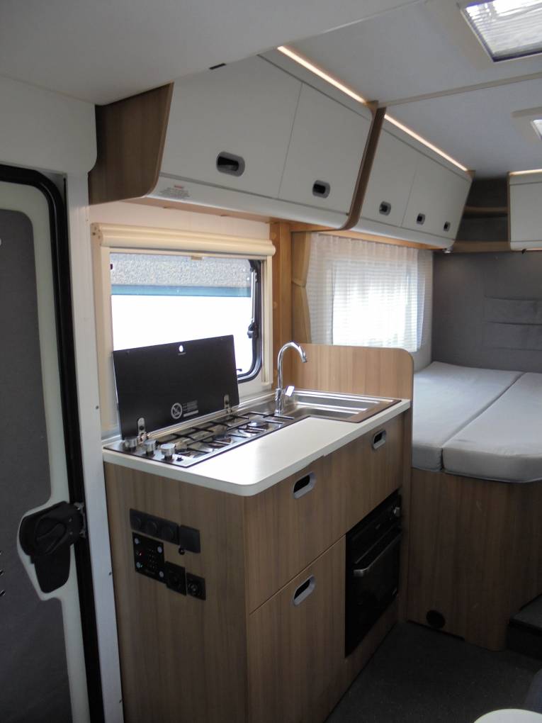 The kitchen is equipped with a 3 gas burner hob, Thetford oven and grill, large Thetford slimline 3-Way Fridge/Freezer and plenty of cupboard storage. The front lounge has a full dinette with a single bench seat opposite the dinette which all brings a comfortable and practical living space for all the family to relax in. The Sun Living S70 DF comes with Light Wood furniture with High Gloss Cupboard finish and Mercurius Upholstery as standard.