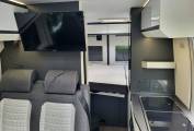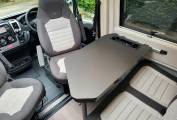As you step inside you immediately notice that the inside is as well presented as the exterior of this motorhome. At the front of the motorhome there are two captains chairs and two extra belted seats allowing for 4 travelling seats and a seating area around the table for 4.
