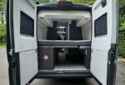 At the rear of the motorhome you find a large double bed, with a third bunk made up at the front of the van. The bed is over a large storage garage that can be accessed from the inside or through the rear doors.