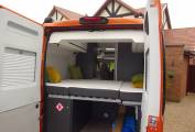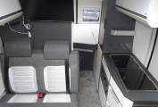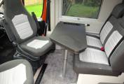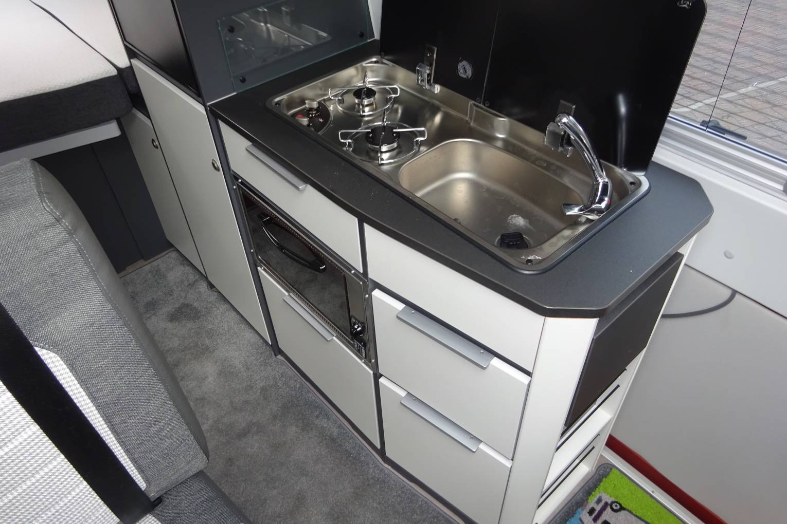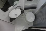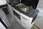 As you step inside you immediately notice that the inside is as well presented as the exterior of this motorhome. At the front of the motorhome there are two captains chairs and two extra belted seats allowing for 4 travelling seats and a seating area around the table for 4. At the rear of the motorhome you find a large double bed, with a third bunk made up at the front of the van. The bed is over a large storage garage that can be accessed from the inside or through the rear doors. You then come to a very nice, well equipped kitchen, fitted out with an oven, 2 burner gas hob, sink and a large fridge with ice box. There are plenty of storage cupboards and compartments throughout the living and kitchen areas giving you excellent storage in a compact motorhome. Across from the kitchen is a lovely bathroom equipped with sink, toilet and a shower. The shower cubicle is designed so as to not require a curtain.