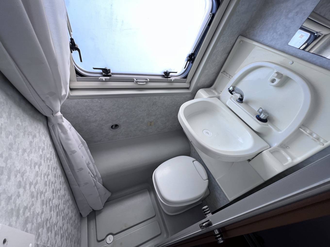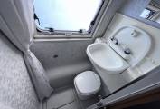 Behind the belted rear seats is a wardrobe and in the rear corner a wetroom style bathroom where you will find a Thetford Flush Cassette Toilet and a tip up washbasin with a Shower Head.