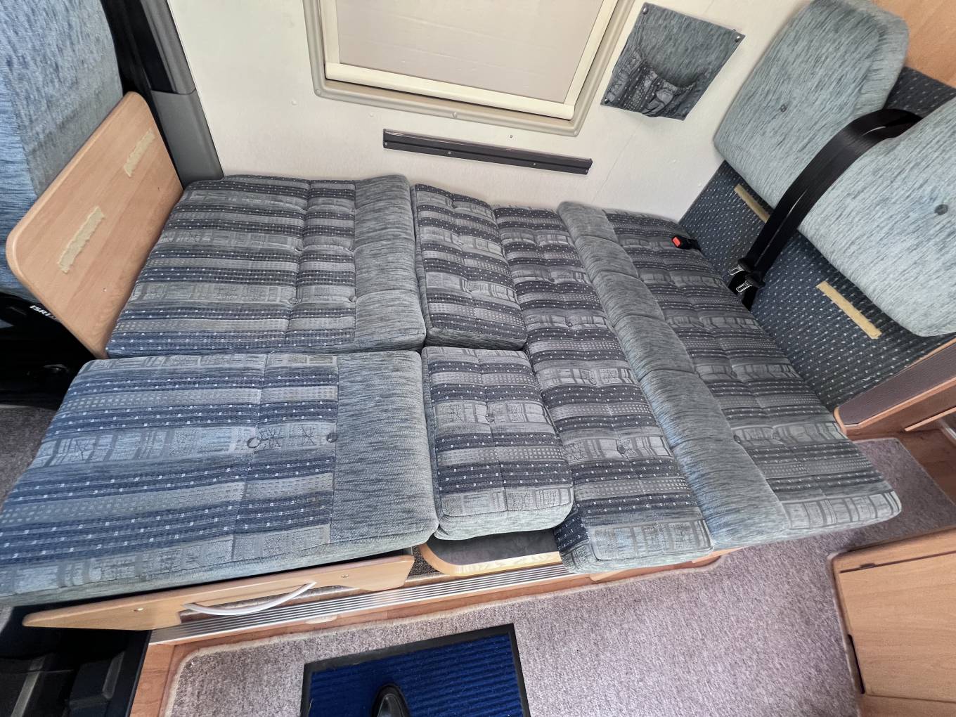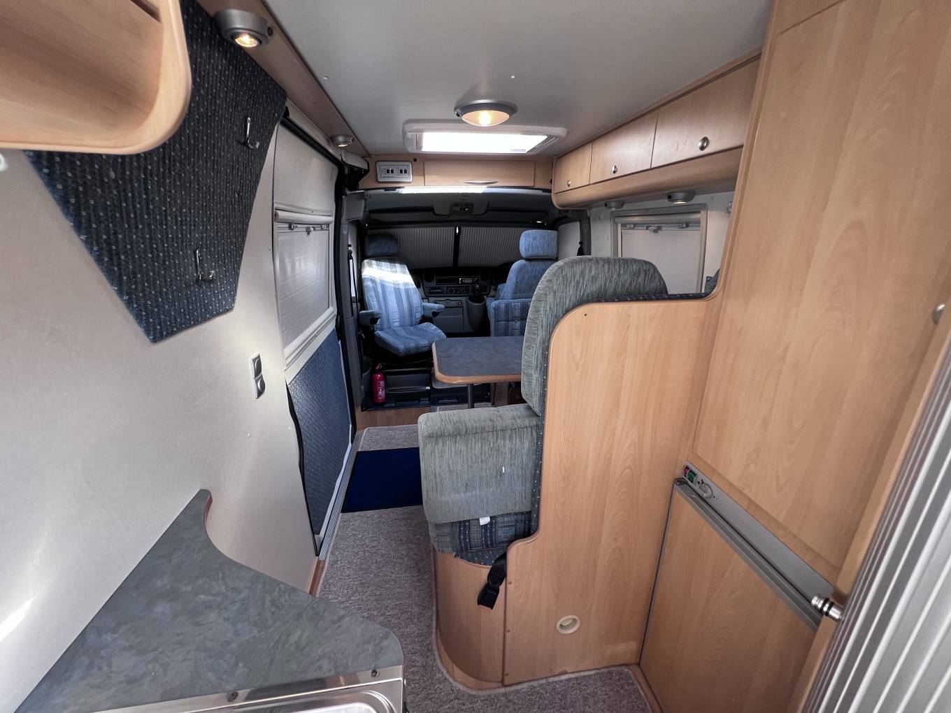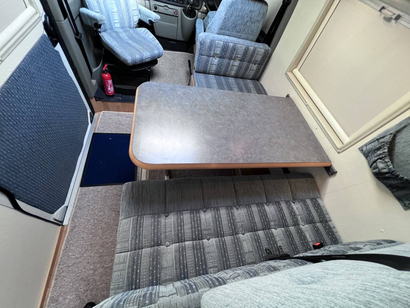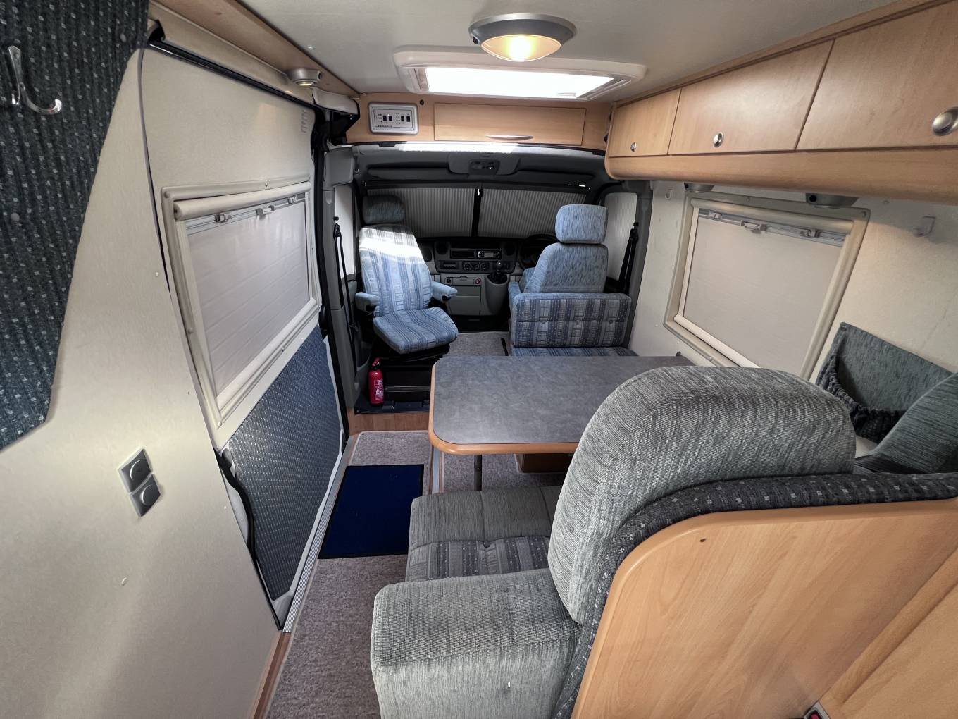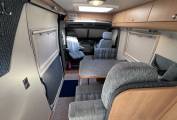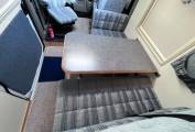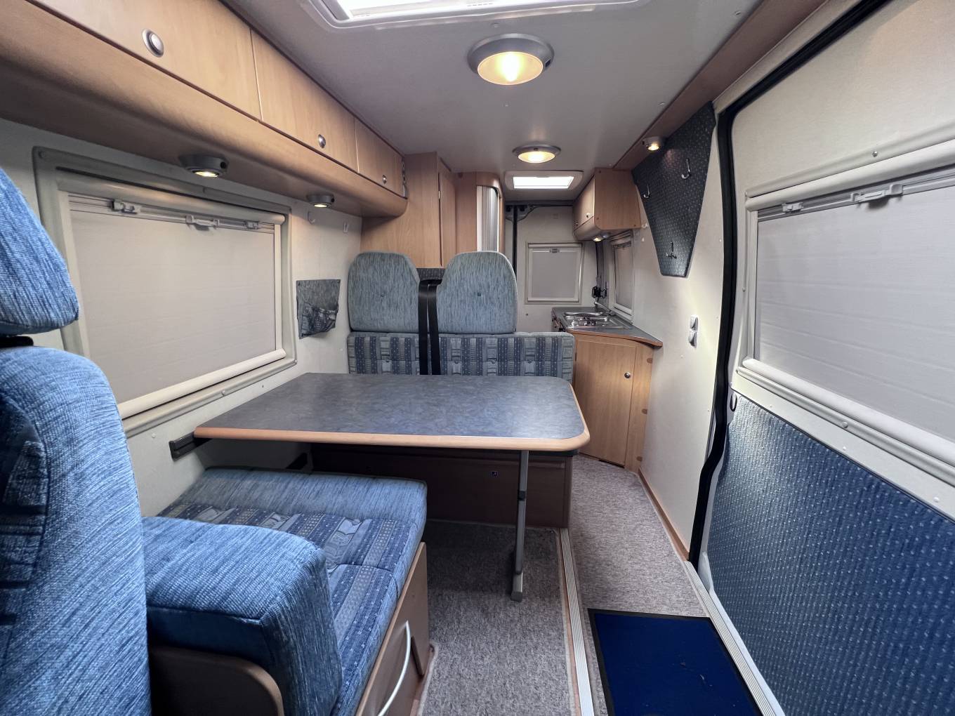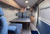 On entering via the large sliding side door up the electrically operated step, in front of you is the lounge dinette area consisting of twin forward facing belted seated, a single seat opposite and a swivelling front passenger chair.