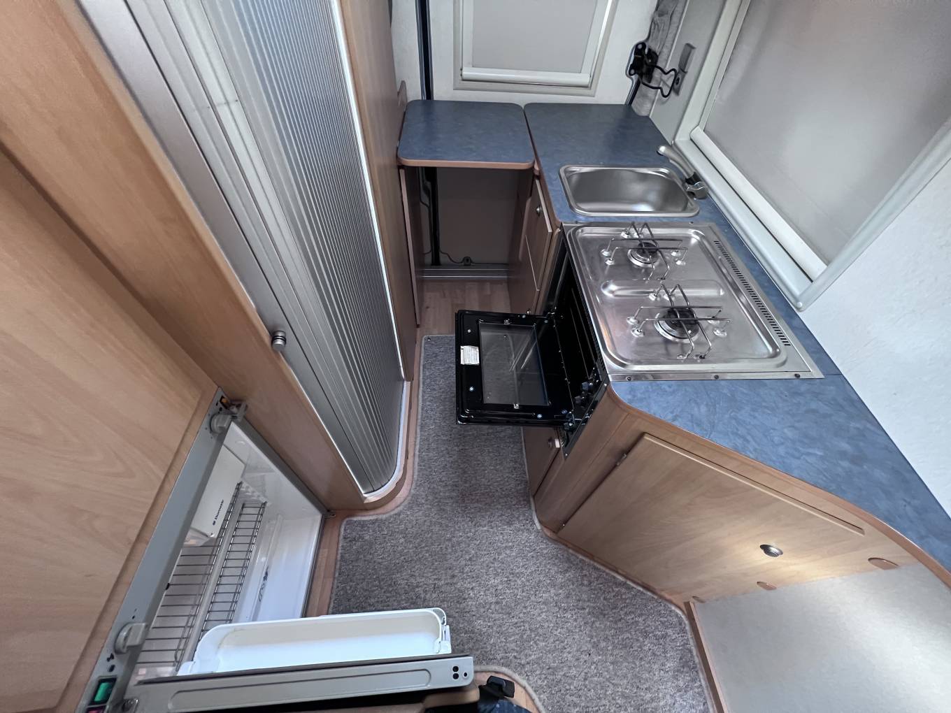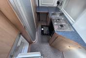 Opposite, to the right of the entrance door is the kitchen. Here there is a Two Burner Gas Hob, an Oven and Grill, a Three energy source Dometic Fridge, a sink with hot and cold water supply and plenty of cupboard space.