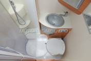 The washroom has a round separate shower cubicle with revolving perspex shower door, a built-in washbasin with chrome mixer tap and a cupboard above and one below, plus there is a Thetford cassette swivelling toilet with electric flush.