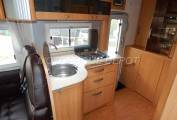 Enter using the electric step and the kitchen / galley is to your right, with a good sized worktop for preparation, a stainless steel hob with 3 gas burners, a round stainless steel sink with chrome designer mixer tap, a built-in waste bin, upper and lower cabinets plus 3 storage drawers, opposite is a Dometic tall fridge with separate freezer box that is 3-way powered, above is a combination gas grill and oven.