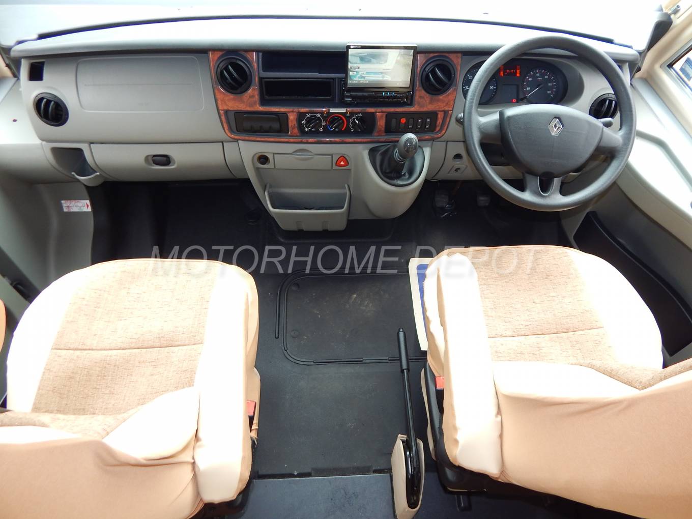 The cab has air-conditioning, a Kenwood CD Tuner with built-in touch screen that also enables you to view the reversing camera, there are reversing sensors, 2 swivel seats, 6 speed manual gearbox, built-in privacy blinds, central locking and electric mirrors.