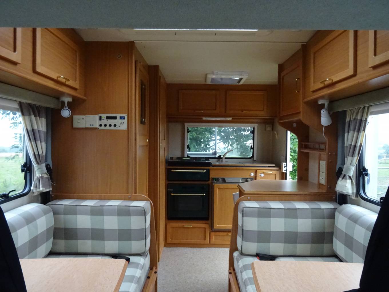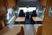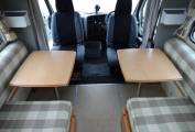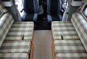 Moving into the lounge/dining area, we have a symmetrical set up with 2 opposing single seats, which have 3 point seat belts, with their own tables. It's also family friendly and ideal for small kids due to the ability to carry two rear facing car seats should that be necessary, or forward facing These seats can also be converted into double bench seats, or 2 single beds. The whole area can also be converted into a good size double bed. Again this area has good all around attractive storage cupboards and is enhanced by swivel captain chairs and the large skylight.