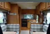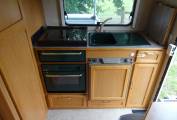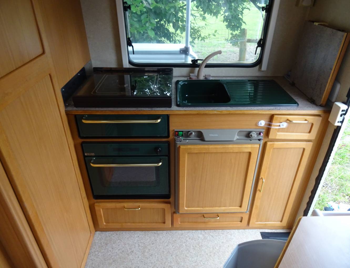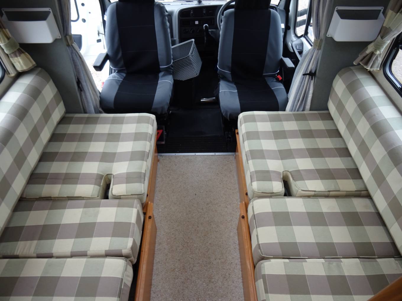 Here we have a surprisingly spacious Auto Home Wild Wind Lux 1999 model built on a Peugeot Boxer. At the rear, we have a practical and clean rear kitchen with good sized 4 hob, cooker and grill. There is a 3 way fridge, sink and drainer with covers for extra work top. Above are nice looking storage cupboards. Also at the rear is the Washroom with cassette toilet, integrated shower with curtain, wash basin and vanity storage cabinet. Adjacent to this is a small wardrobe, with Carver heater below. Opposite is a small workstation cleverly concealing the large gas bottle storage area (with room for 2 gas bottles), again with storage above.
