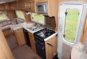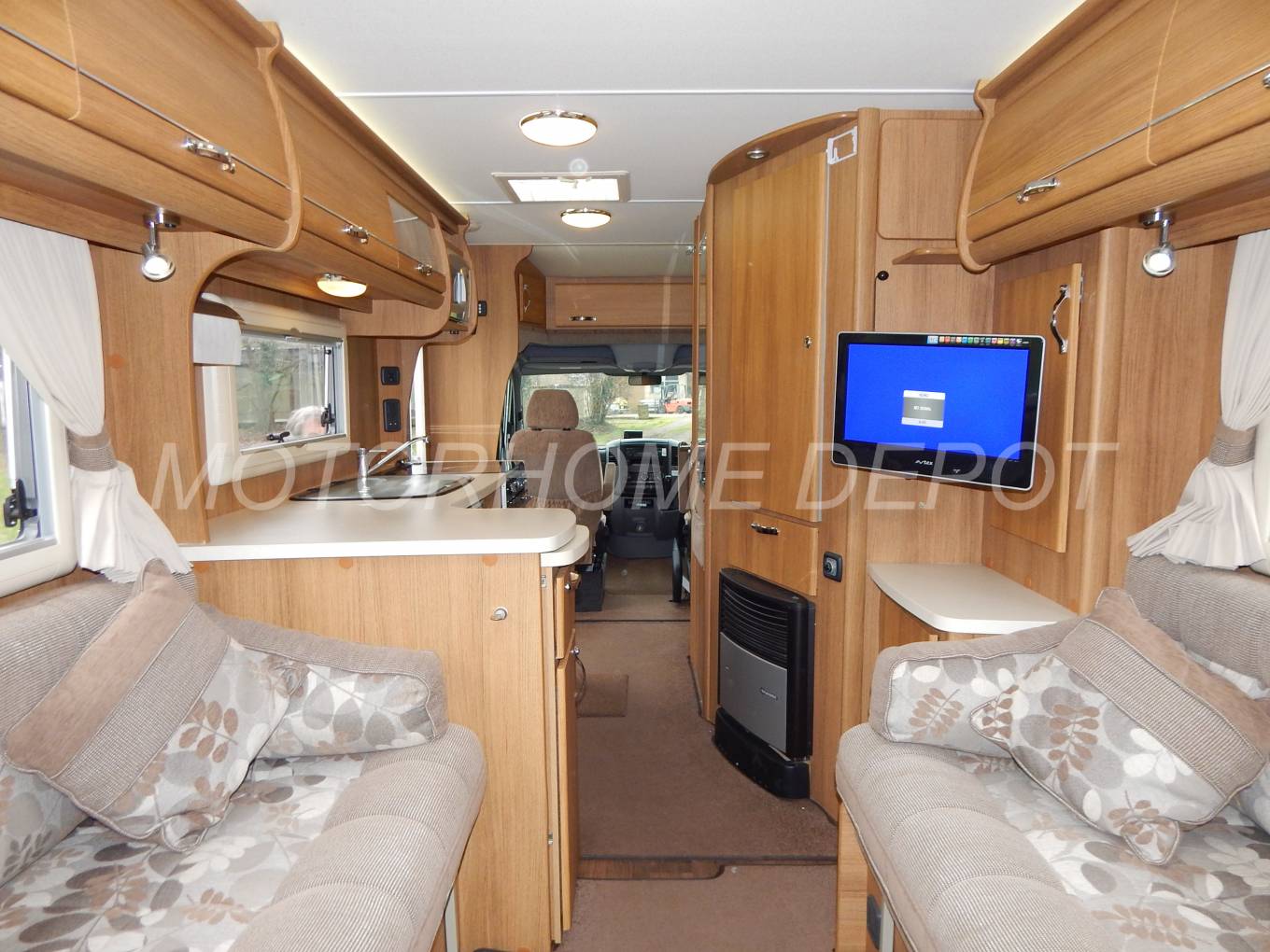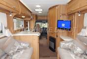 The main feature is the sought after rear U-Shaped Lounge, very light and airy with a large sunroof above, a large dining table is supplied that stores away when not in use. The two sofas can be used as single beds or you can make up a very large double bed in the evening. A clever corner drop down drinks cabinet, a further drinks cabinet is located behind the included AVTEX TV with built-in DVD player. Upper aircraft style storage lockers and under seat storage available.