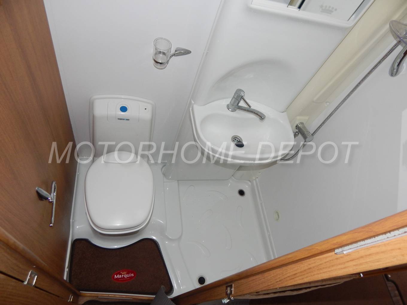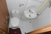 The washroom has a clever swing round panel to make up a large separate shower cubicle, there's a washbasin with mixer tap and a Thetford cassette swivelling toilet with electric flush and a mirrored medicine cabinet.