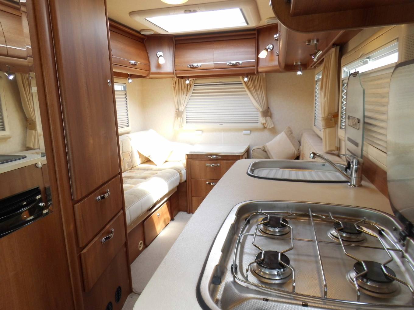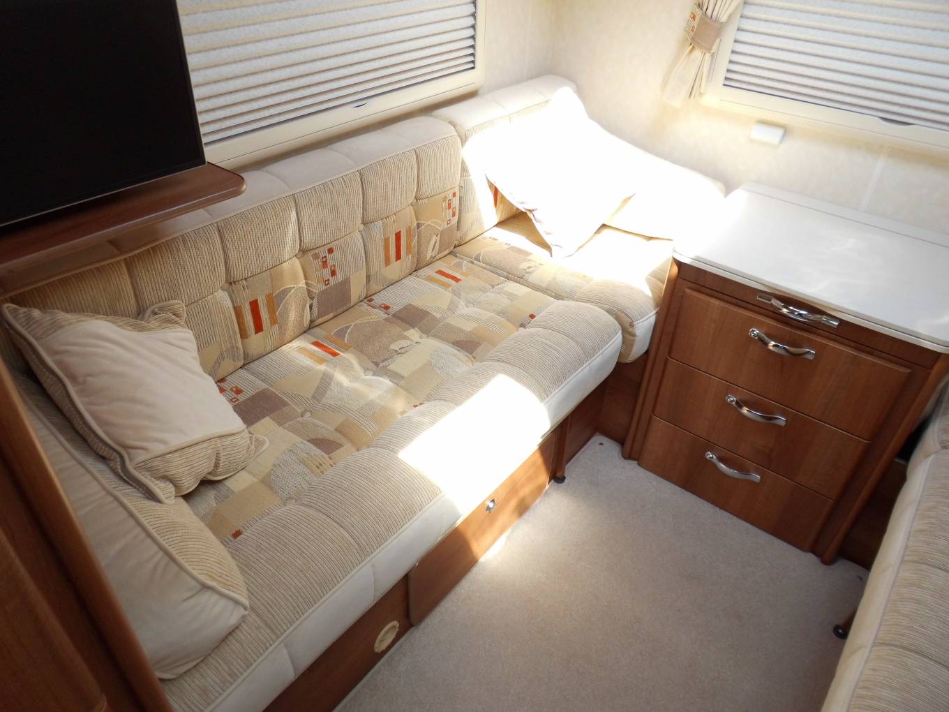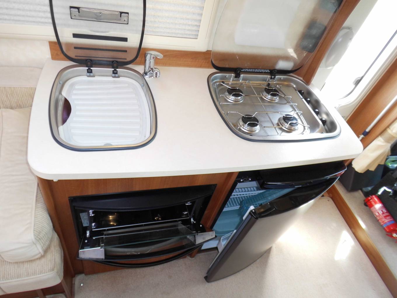 Outside there is a Fiamma habdoor security and hand rail, neatly recessed awning, awning light, 2 bike cycle rack, rear corner steadies, gas locker with two bottles, additional storage pannier locker with access to under the lounge bench sofa, wheel chocks and a mains hook up point, including the electrical hook up cable .