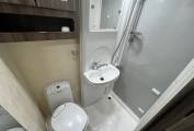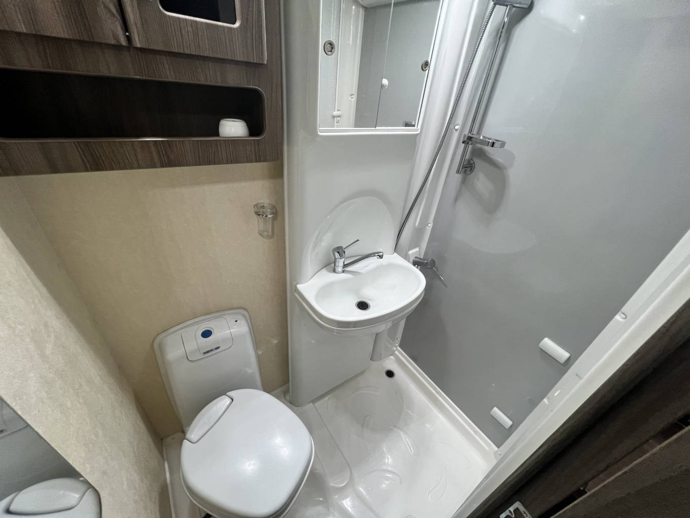 In the opposite corner is the bathroom, consisting of a Thetford Flush Cassette Toilet, a Wash Handbasin and a separate Shower Cubicle by means of a the hinged wash basin door.