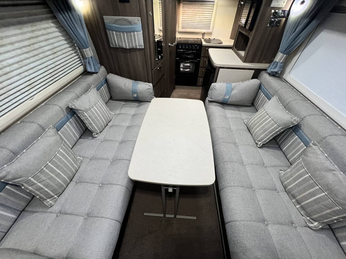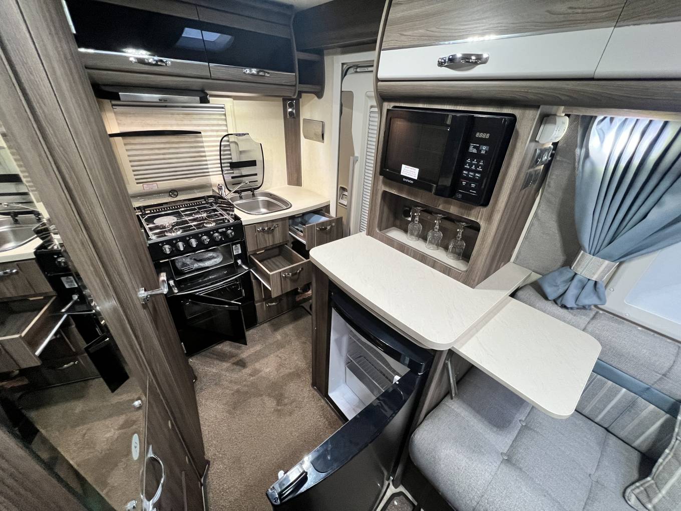 Here you will find a Three Gas and One Electric Hotplate Hob with Extractor Fan above, a Separate Grill and Oven, a Three Energy Source Thetford Fridge, a Microwave Oven and a Sink with Hot and Cold Water supply, plus an extendable worktop and plenty of cupboards and drawers.