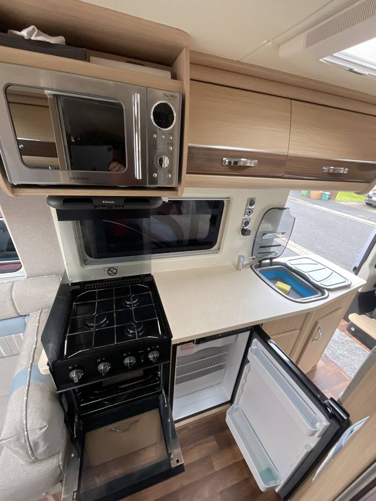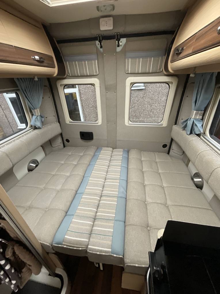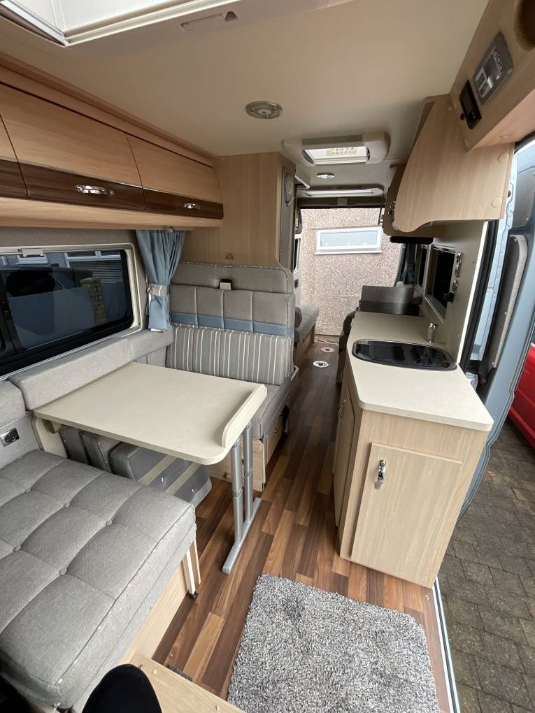As you step into the motorhome by the side sliding door, directly in front of you is the front dining area with two bench seats plus the swivel passenger seat with good access to the cab in front. In the centre of the motorhome, you will find a very nicely equipped kitchen area complete with 3-burner hob, oven, grill, under-counter 3-way fridge with freezer compartment, microwave, sink with mixer taps, TV connections and loads of worktop space and cupboards above and below. On the other side is the washroom with Thetford cassette toilet, shower and washbasin with mixer tap. At the rear of the motorhome is the lounge area that has a large and small stowaway table that can be utilised. This area converts to a double bed as well as the dining area upfront that also transforms into a double bed for the evening. Blown-air heating and hot water is supplied by the Truma Duo, gas / electric system with all the controls found above the entrance door. Also fitted there are Remis cab blinds, Thule, wind-out awning, external BBQ point, LPG tank, Tow Bar, Reversing Camera and a solar panel. The vehicle will come with a new 12 month warranty, supplied by the current owner.