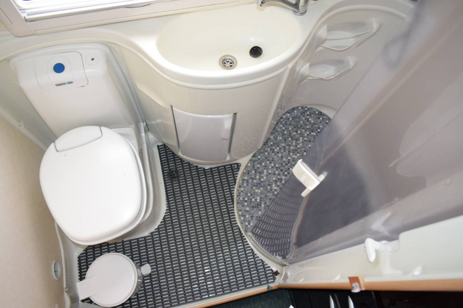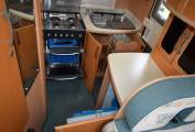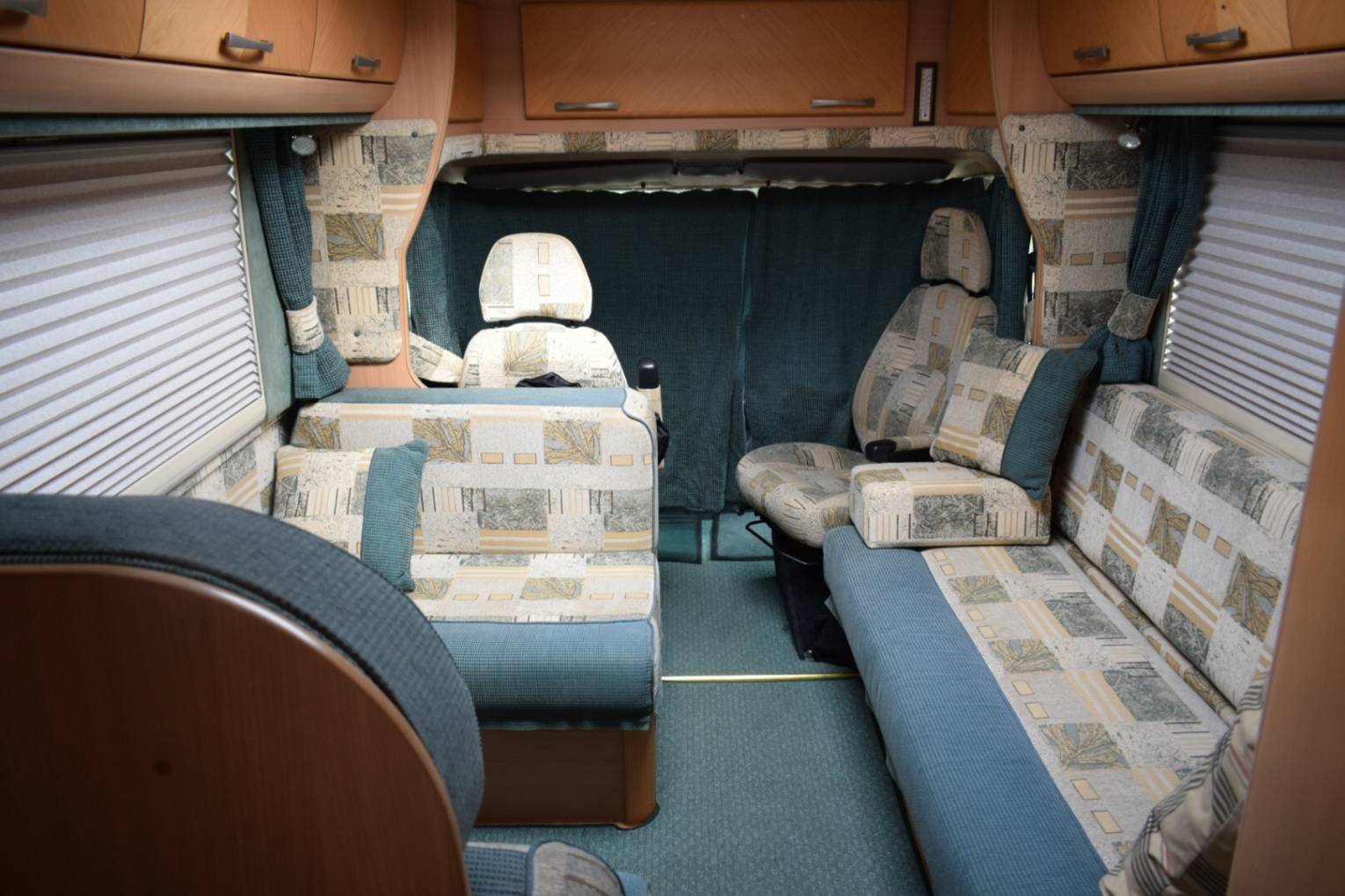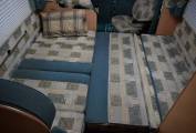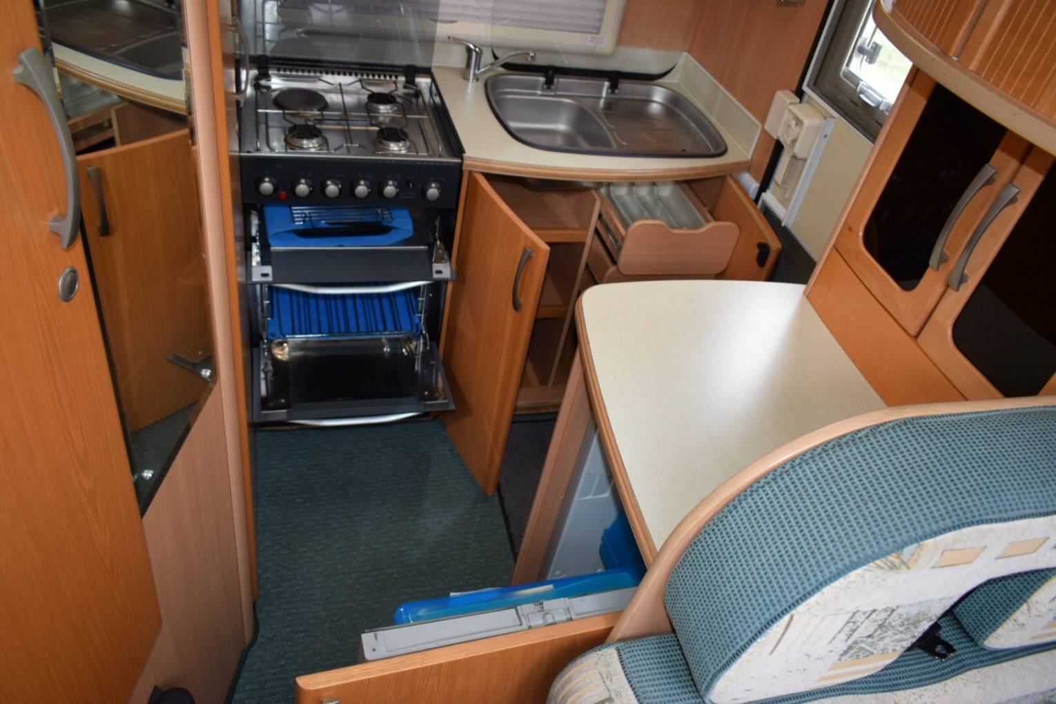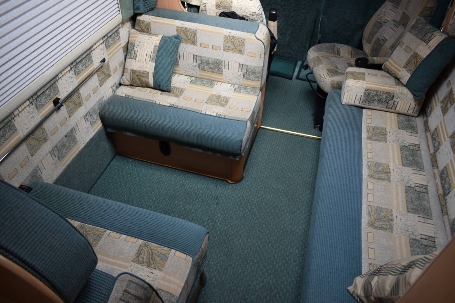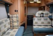 On entering via the caravan door which has an added security lock and grab handle, also a flyscreen, across the back of the Inca is the kitchen and in the far corner the bathroom. The fully equipped kitchen consists of a three gas burner and one electric hob, a separate grill and separate oven, a sink with a drainer and plenty of cupboards. The Three Way Dometic Fridge is the other side of the door with worktop above plus a cocktail cabinet and a television unit above that containing relevant sockets and connections. In the corner bathroom the Thetford Toilet on the left, wash handbasin in the middle and a separate shower on the right. Forward of the bathroom is the wardrobe with a Truma gas and electric heater below. The central lounge has a large settee on the driver’s side and twin seats facing each other on the passenger side. The forward facing pair have three point seatbelts. A removable table hooks on the wall here for dining. Both sides convert to single beds and when pulled together make a sizeable double. The driver’s seat also swivels to increase the lunging area. Above the cab there is useable cupboard space. Outside an Omnistor Awning, Towbar, back storage box and a TV arial have been fitted.