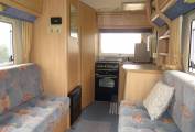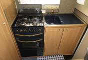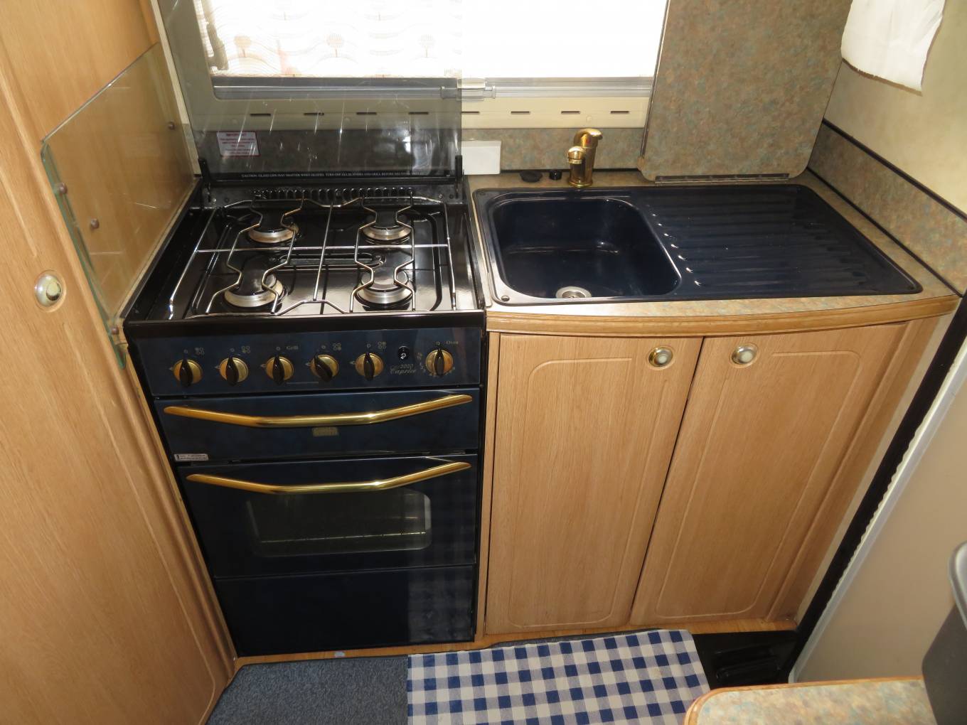 The layout is excellent for a small motorhome with a spacious lounge/sleeping area at the front and end kitchen and washroom at the back. At the front the lounge is made up of two side sofas and the front two seats that both swivel round. There is also a cleverly stored self standing table that can be placed in the centre to create an ideal place to enjoy a meal or snack. The Lancashire has a well equipped kitchen which includes an oven, grill, gas hob with 4 gas burners, sink with mixer tap and 3-way fridge with ice compartment.