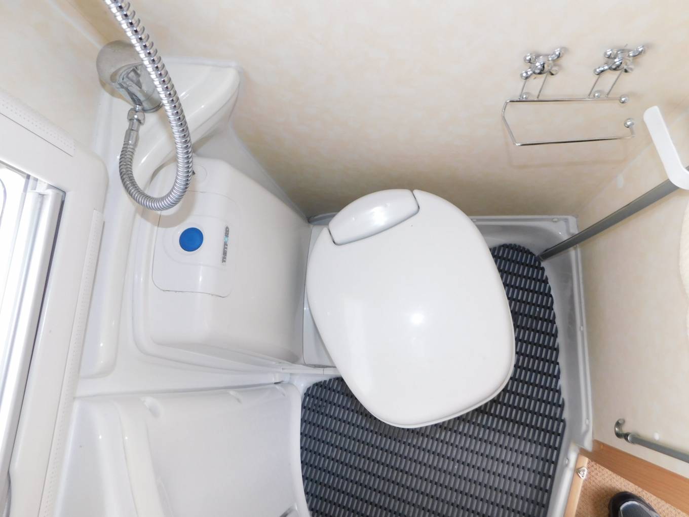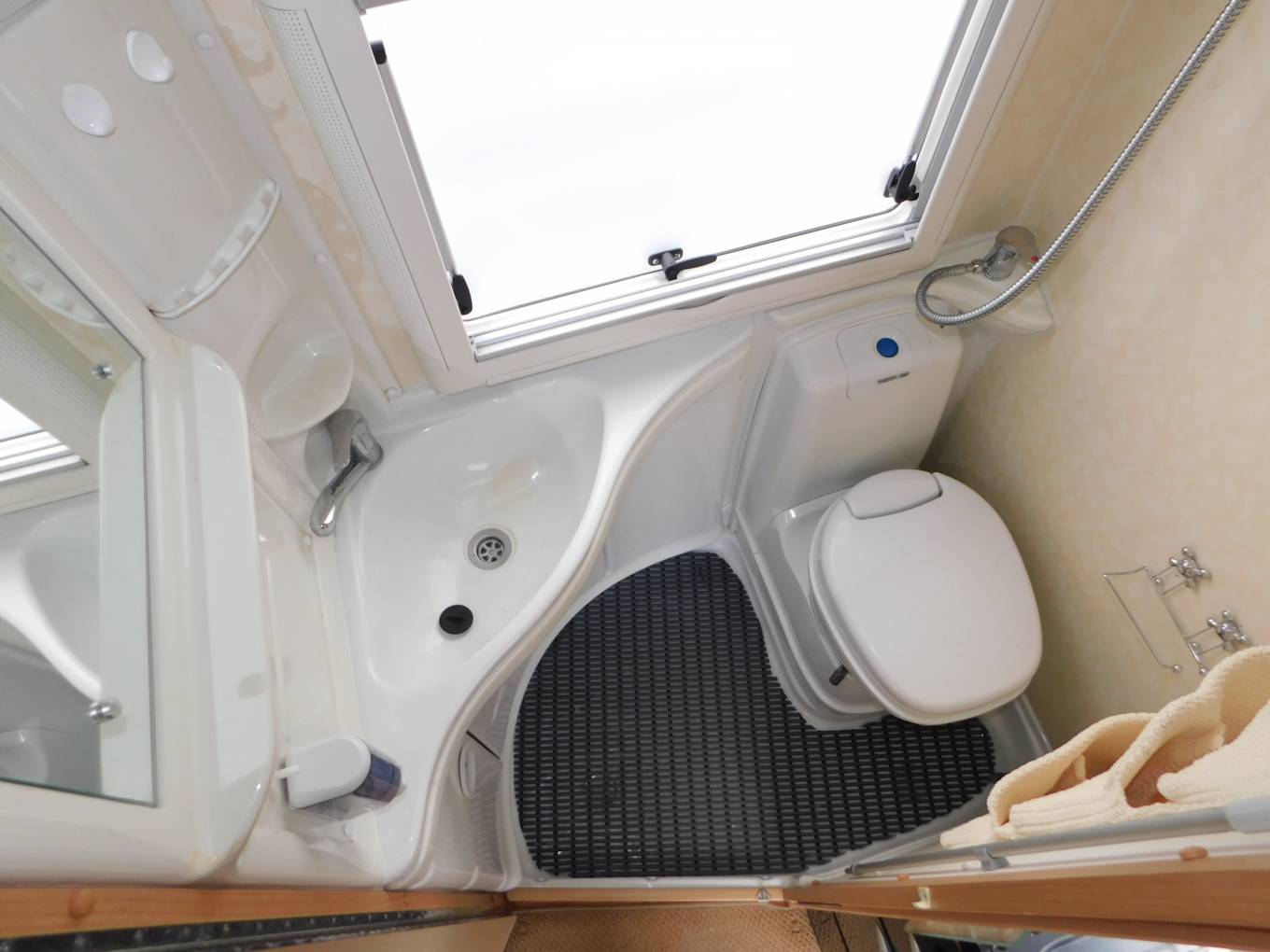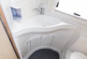 - The washroom has a large shower tray, a built-in washbasin with mixer tap, cupboard beneath and mirror above, a separate shower tap and shower head, plus a Thetford cassette swivelling toilet with electric flush.