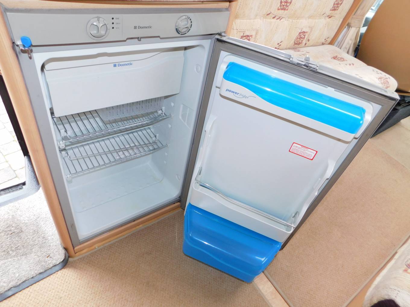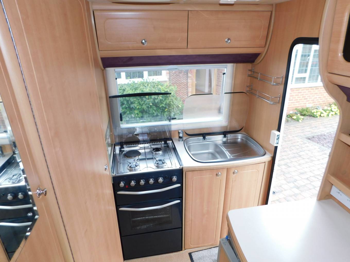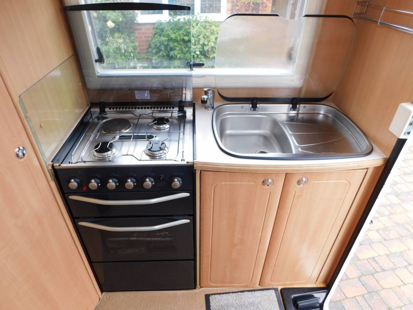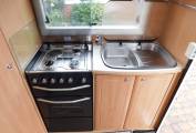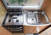 - Step inside and the kitchen is on your right, with a large stainless steel sink with glass lid and chrome mixer tap, a dual fuel stainless steel hob, with 3 gas burners and an electric hot plate to save gas at camping sites, a gas grill and oven beneath plus plenty of cabinets to store away your holiday provisions, behind you is a three-way powered Dometic fridge with ice-box.