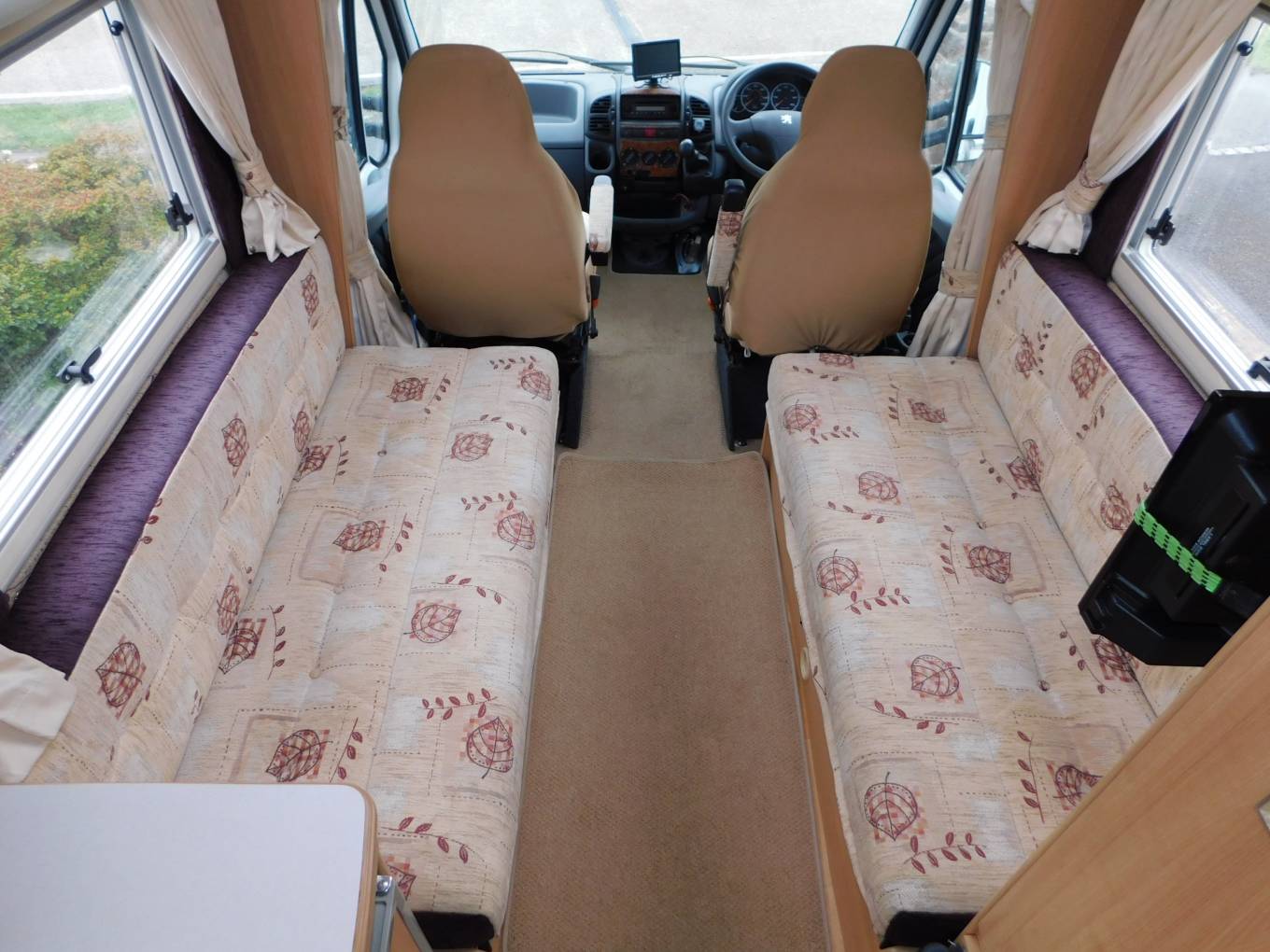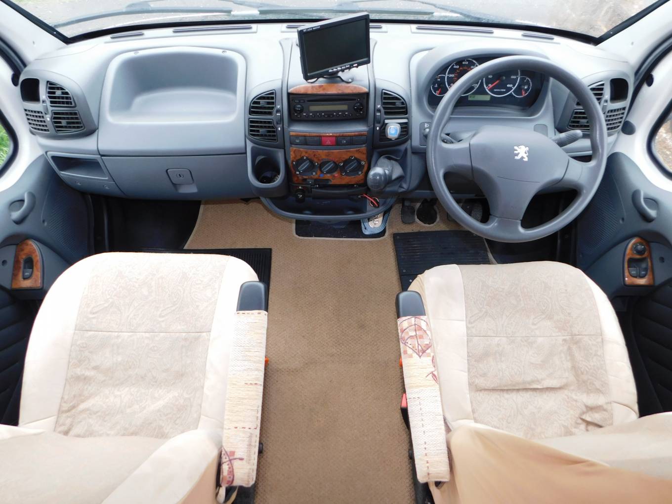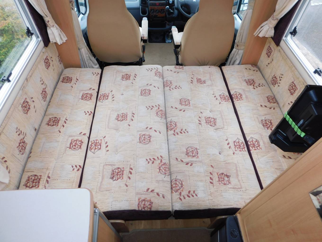 - The cab has two swivelling seats, a CD Tuner, 5 speed manual gearbox, privacy curtains, silver screens included, electric windows, mirrors, central locking plus a reversing camera monitor. Above the cab is a large storage cabinet with side lockers. The seat covers on the front seats are purely to protect them, underneath, the seat fabric is in immaculate condition.