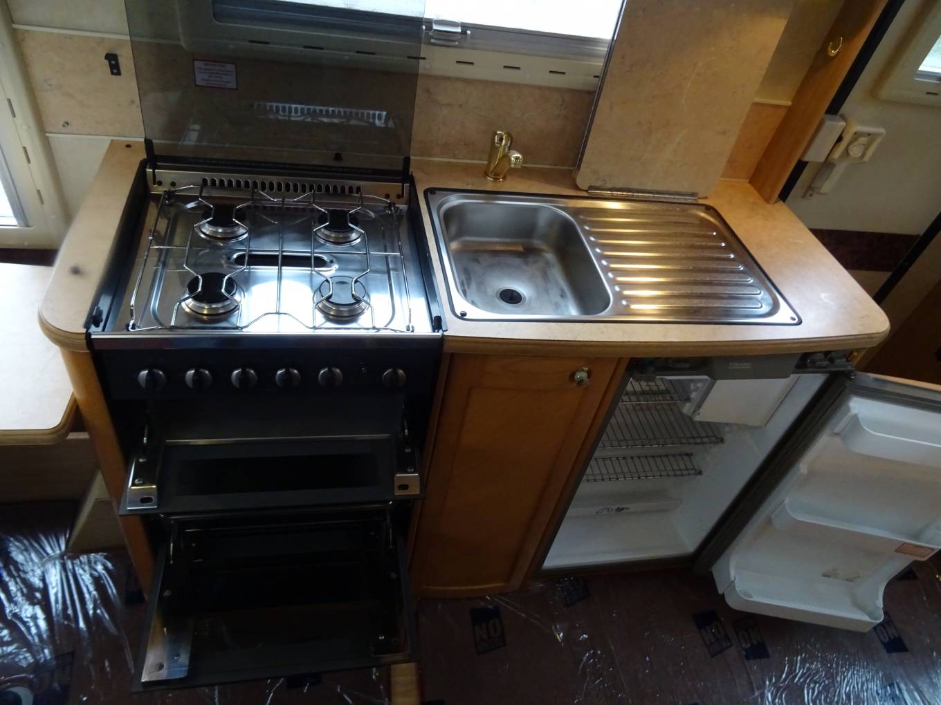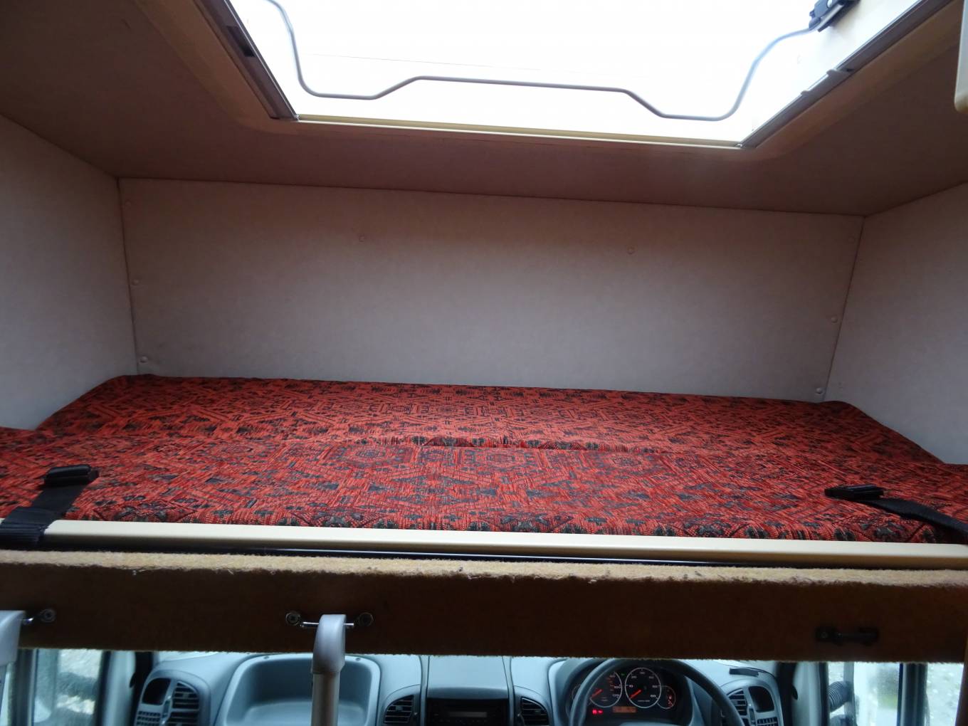 Upon entering the habitation area of this well looked after motorhome, you will notice the main feature being the good sized L-Shape lounge with large windows to soak up all that natural light. There are 2 tables, one for dining that can be stored away in the wardrobe and a small moveable table. This area converts into a large double bed. You also have the spacious over cab double bed to complete the 4 berth.