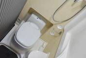 In the other rear corner is the bathroom with a Thetford toilet, wash handbasin and a shower.