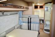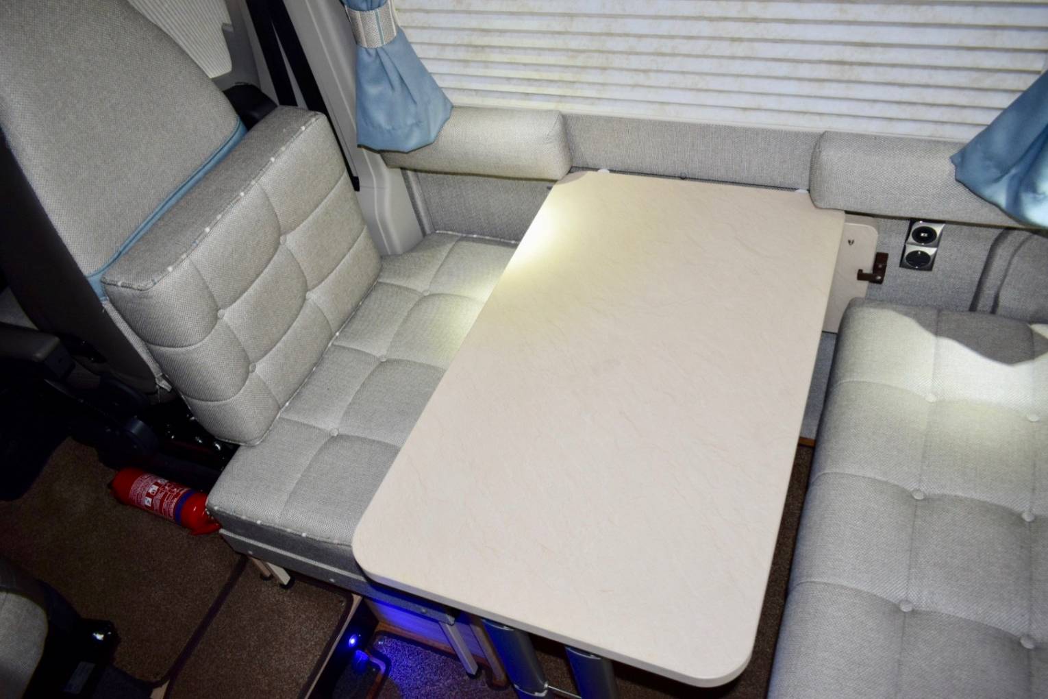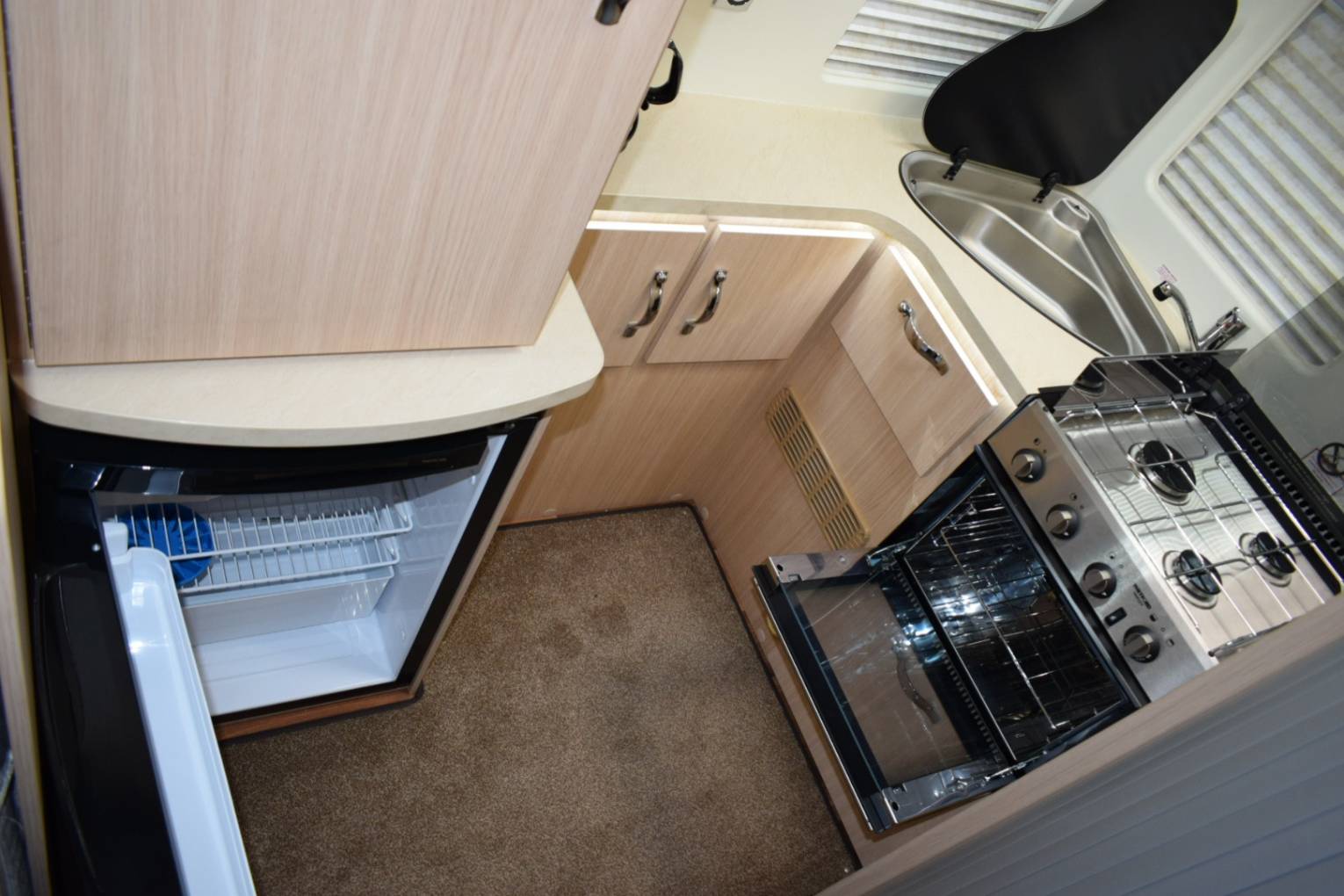 The amazingly equipped kitchen is situated in the rear driver’s side corner. Here you will find a three burner hob, an oven grill, a sink, a three energy source fridge, a microwave oven, plenty of cupboards and worktop plus a 12 volt coffee maker.