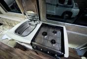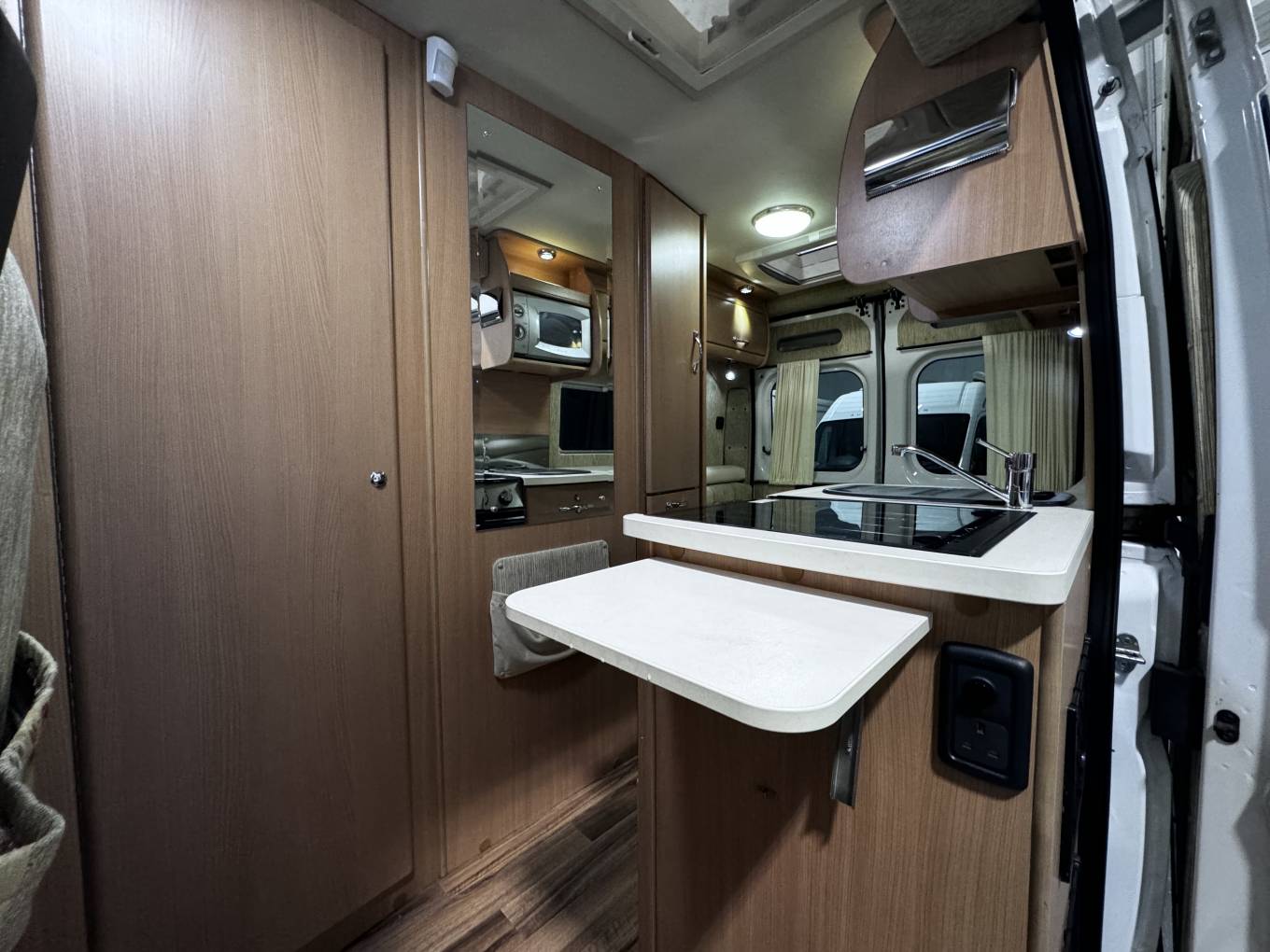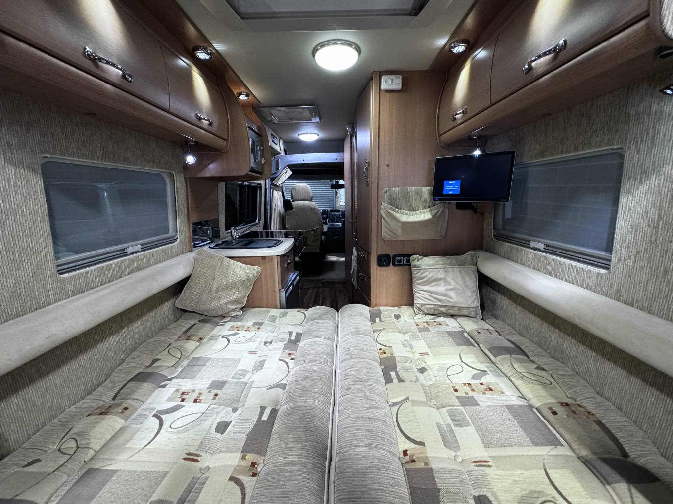 The Autosleeper Stratford is a very popular 2 birth motorhome due to the layout inside. There is an end lounge made up of 2 side facing sofas that very quickly convert into a nice size double bed for the night. The kitchen is mid-side and well equipped with a combi oven and 3 gas hob burners, sink, fridge and a microwave giving you all you need while away. The bathroom is at the front and has the added benefit of a separate shower cubicle along with a toilet and sink. There are plenty of extras on the Stratford including reversing camera, awning and Gaslow making this a great versatile van.