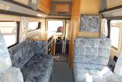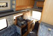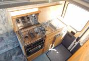 Open the side sliding door and step inside to the lounge and dining area, with a side sofa, and a forward facing single seat that has a three-point seatbelt. There are two dining tables with single chrome legs that all store away neatly when not in use. This area converts to a large double bed in the evening, above the cab and lounge you have a pull out double bed that has a metal access ladder. There is under seat and sofa storage space, plus a fold-down TV table.