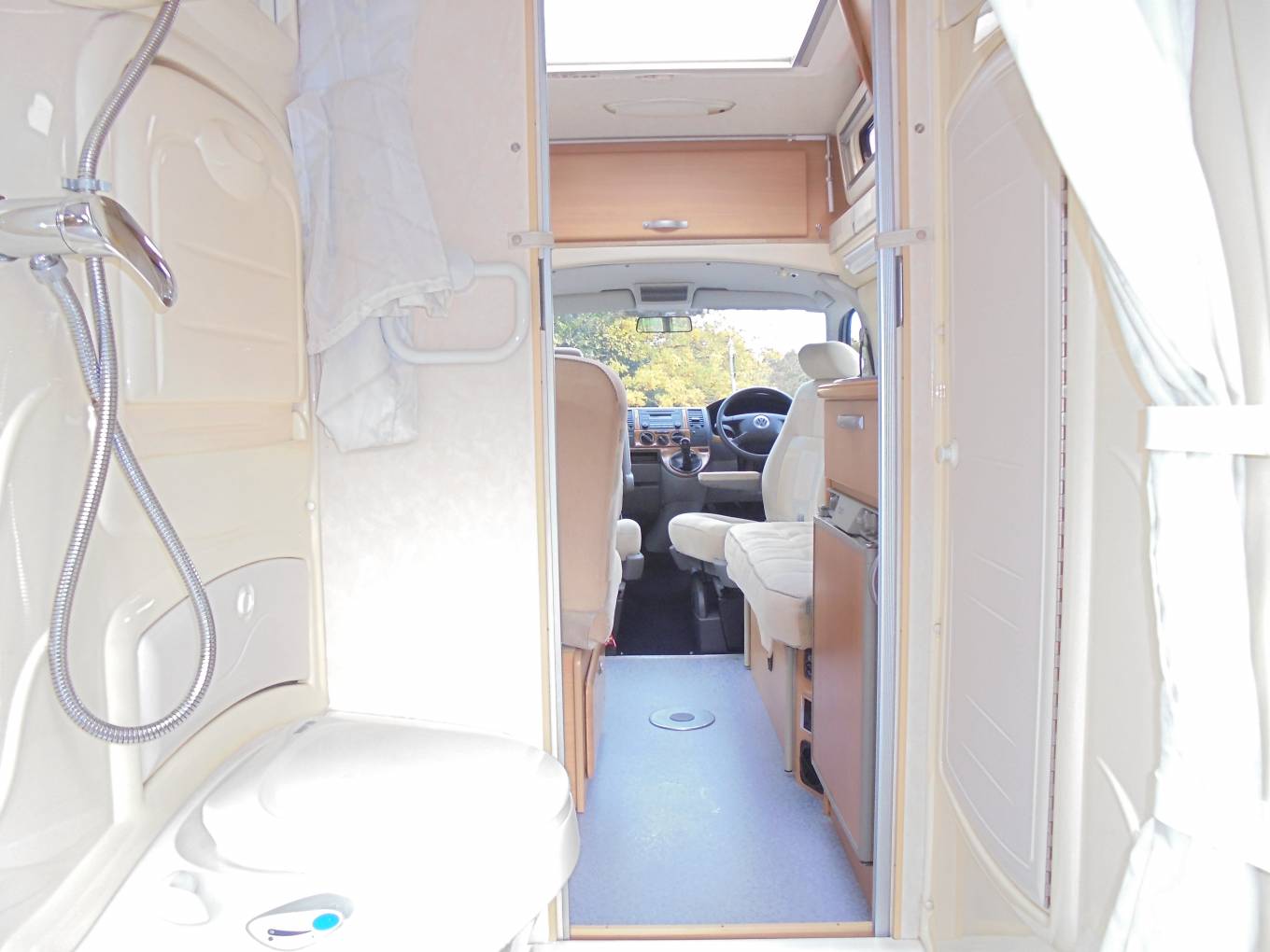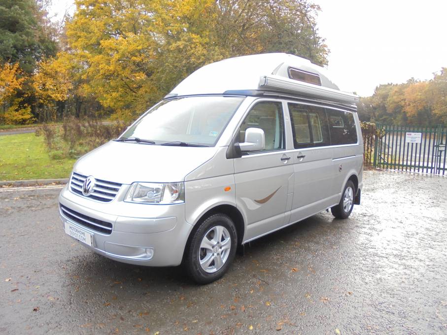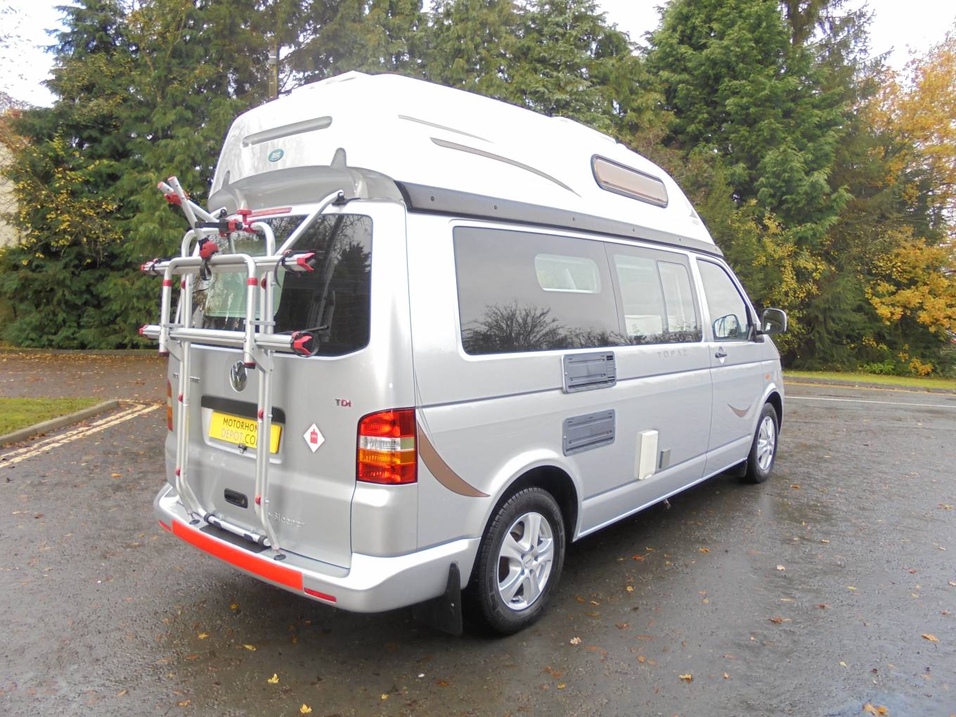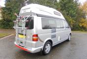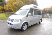 Based on the T5 VW TDi Transporter and with Auto Sleepers high top and rear pod this Topaz is in metallic silver and alloy wheels and a lovely neutral bright and cheerful interior.It drives like a car but has all the facilities you could wish for such as cab air conditioning,awning,bathroom,cassette toilet,shower,hot and cold water,fridge/freezer,2 gas hobs, grill and blown air heating.