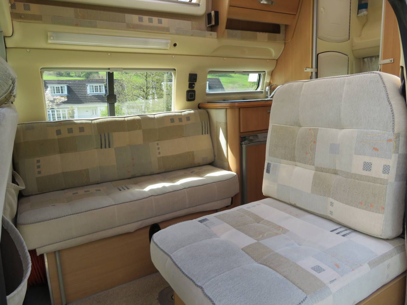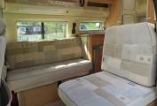 To the front, we have a comfortable side bench as well as a single forward-facing seat which includes 3-point seat belt for that extra passenger. This area also converts into either two single beds in conjunction with the two swiveling seats or also makes into a good-sized double bed.