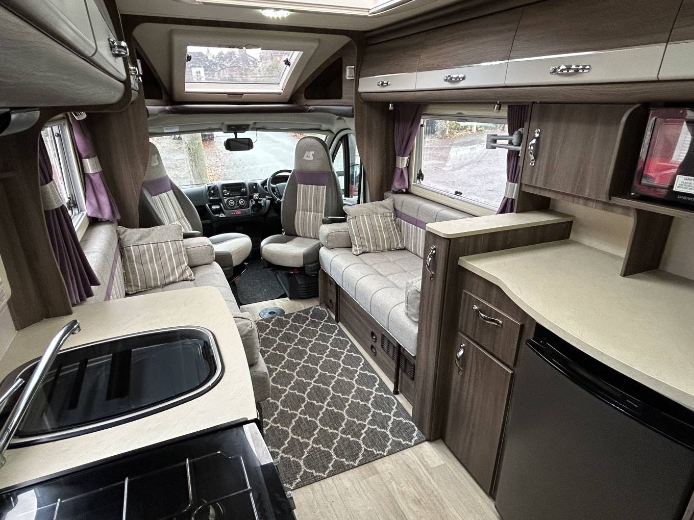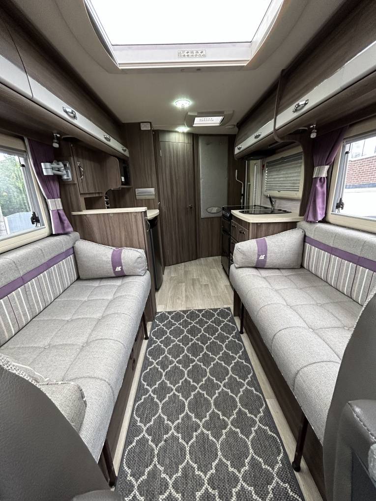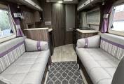 Mid Habitation you have the two side facing lounge seats which make a large double bed in under 60 seconds. When the bed is not in use this area is a great space to relax, eat and enjoy each others company and comes with a fold away table thar is neatly stored away. This area is surrounded by storage lockers that come in great condition and you can also have fitted carpets in place which are not in the photos for the motorhome and offer a cosy feel.