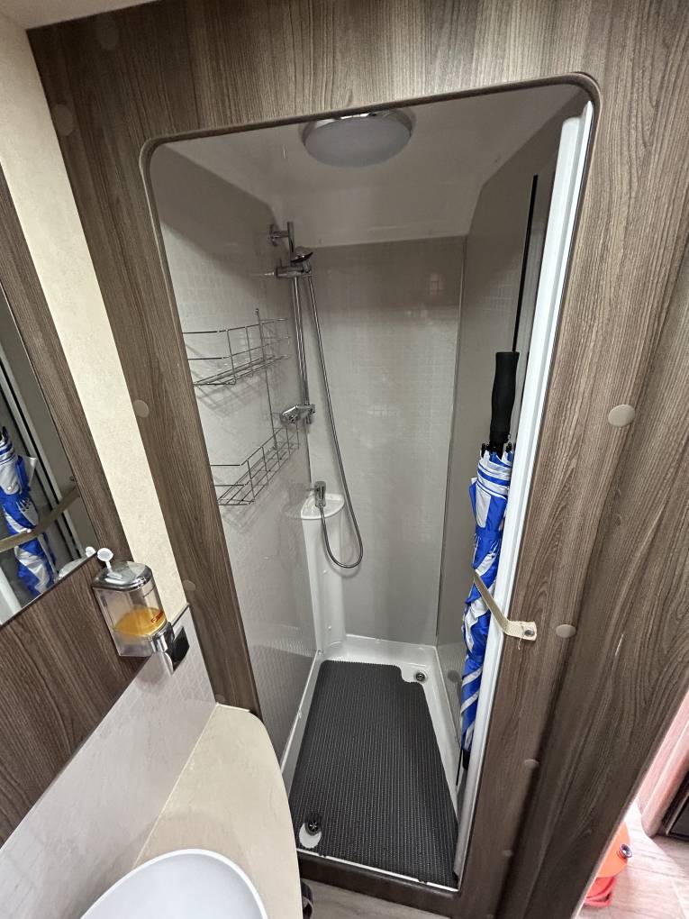 We will start at the rear with the end washroom that boasts a luxury space, the desired Shower Cubicle with Toilet and Washbasin. This bathroom also comes with wardrobe space and that is home to one of the tables for the motorhome and you also get plenty of draws to use as storage as well to ensure nothing is left behind on your next adventure!