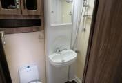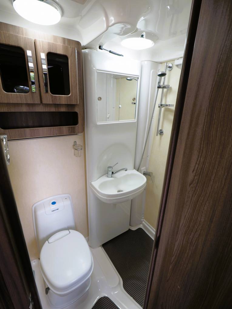 To the side of the kitchen is the well equipped washroom with flushing cassette toilet, vanity unit with cupboard storage to the side and separate wash basin and shower. Real home from home comfort.