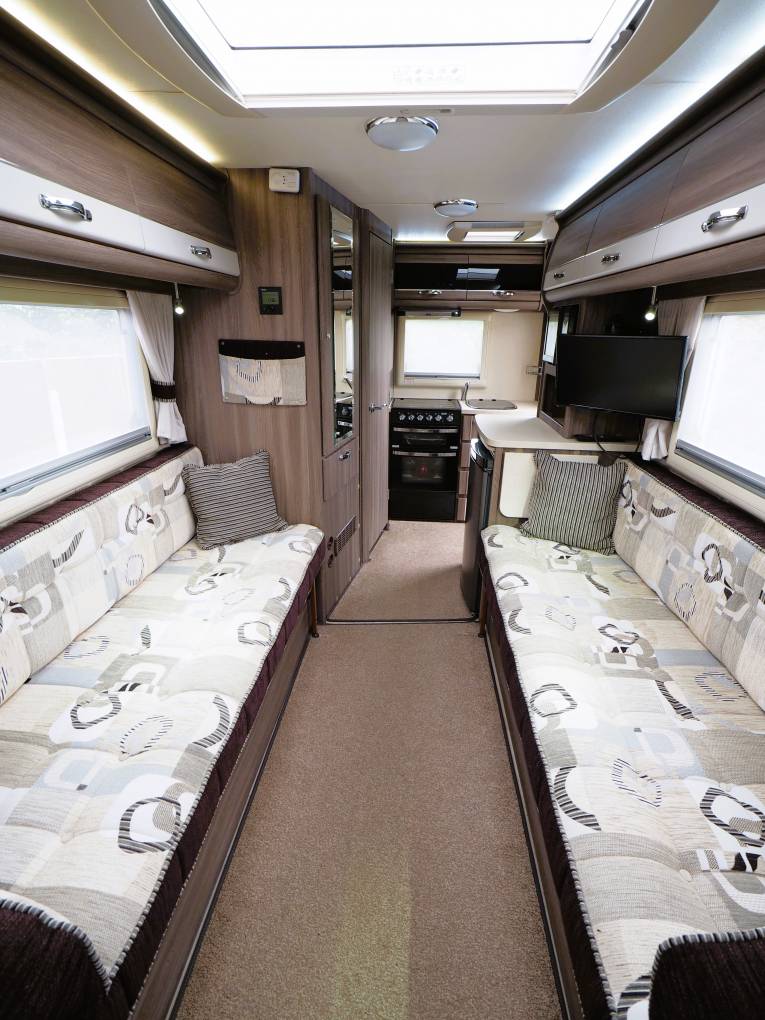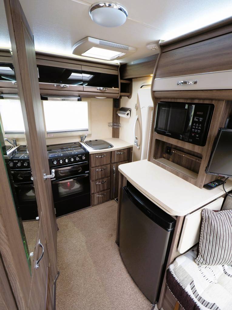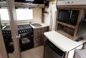 The electric powered step takes you into the end kitchen which is fully featured and will satisfy the most discerning of cooks. A full oven with separate grill and dual fuel hob above, providing 3 gas burners and an electric hot-plate. A sink with drain board and hot and cold running water sits to the side with plenty of storage above and below in the form of lockers, cupboards and drawers. A built in extractor over the hob helps contain cooking smells and there is under pelmet lighting and two 3 pin sockets to the back wall. To the side is further storage and preparation area with an extendable surface providing additional space. A microwave oven sits above and a 3 way fridge with freezer box sits under the counter.