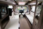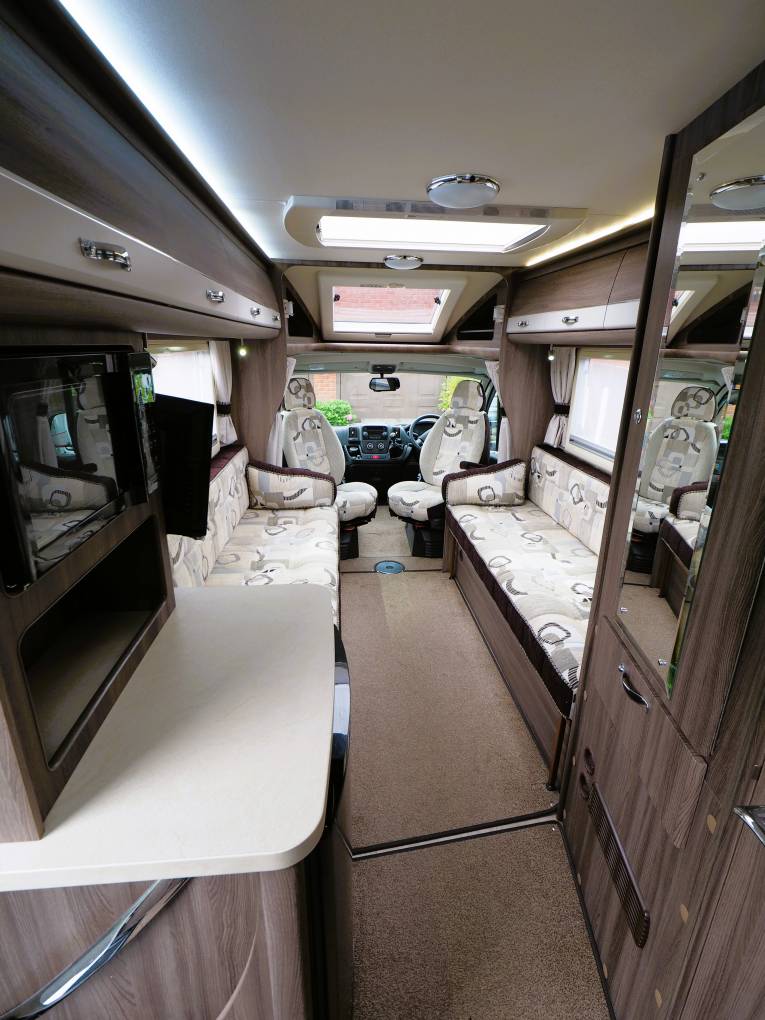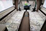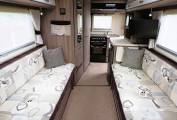 The lounge is a bright and spacious area with two long sofas running along each side. Gives comfortable seating for 4 adults with the additional option of using the armchair style front Captains seats as they both swivel to face into the habitation area. Plenty of natural light from the large windows and overhead skylight with individual courtesy spotlights to both sides. Both a small "coffee table" and larger dining table are provided to give options for eating, working or play. Storage under the sofas and in the overhead lockers to both sides, provides lots of space for all your bits and pieces. A TV point is conveniently located to the one side and a Cello TV and mount are included.