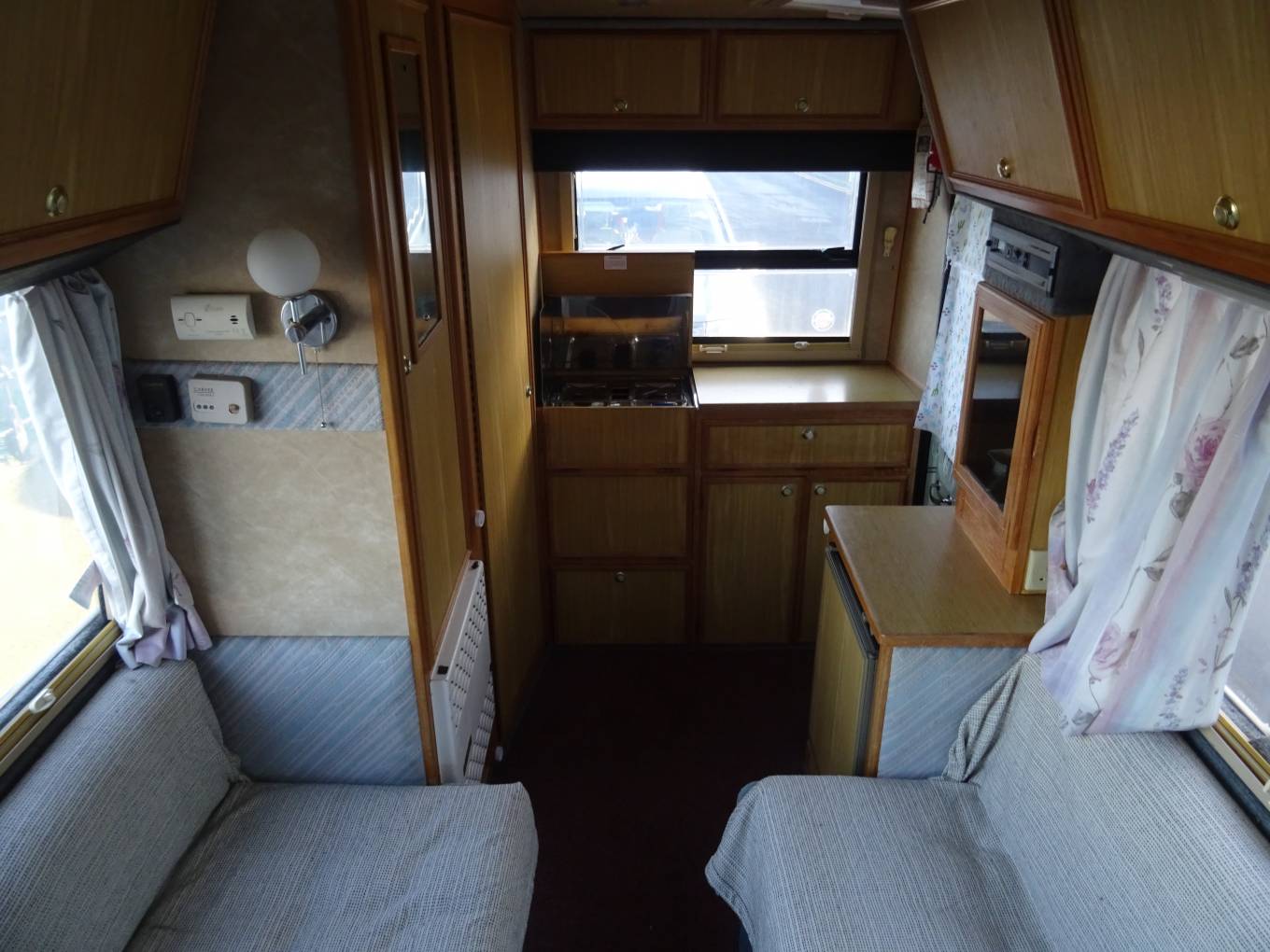 A rear kitchen layout is fully equipped with gas hobs, oven and grill, tap with water pump, three way fridge and plenty of storage.