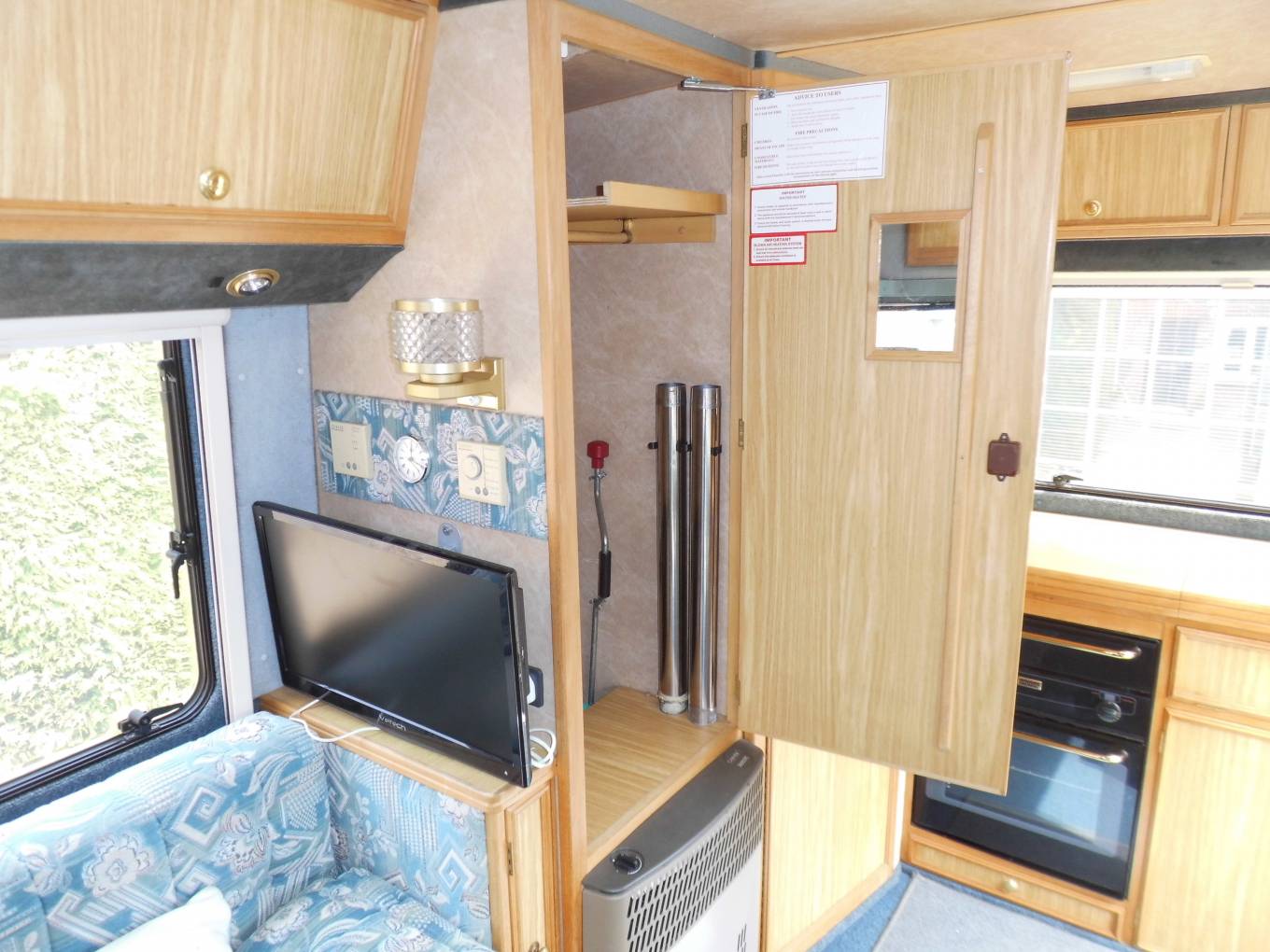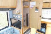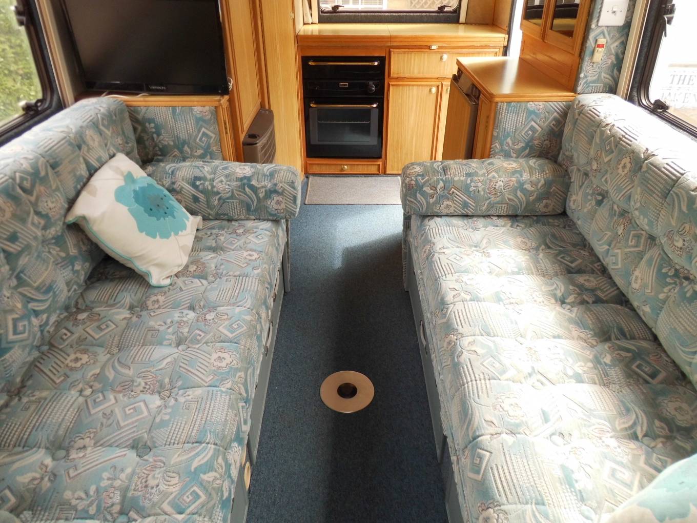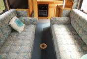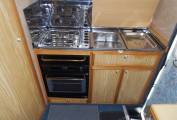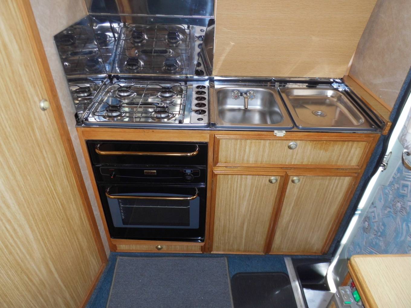 At the rear is the kitchen with an oven and grill, a 4 gas burner hob, a 3 way fridge freezer, a stainless sink with tap, a drainer hidden away under a hinged work surface and cupboard space for utensils and crockery.